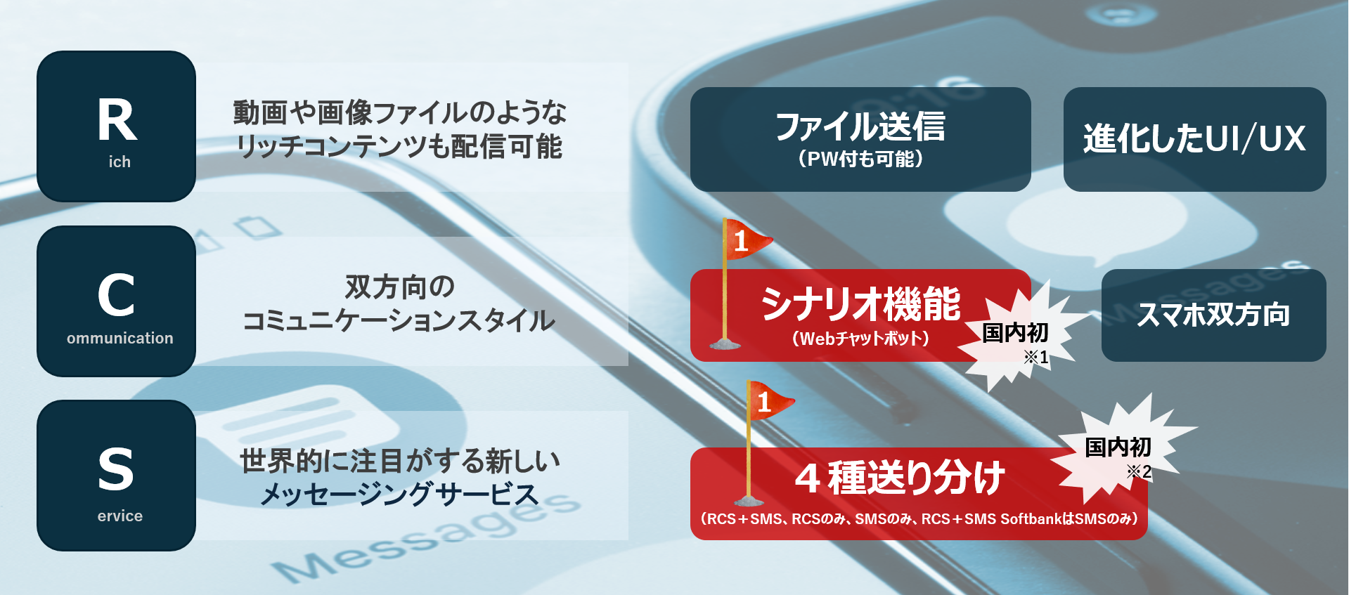 ※2:RCSとSMSを4種類のパターンで送り分けができ、利便性高いメッセージ配信ができる機能。2024年9月現在、国内SMS会社の中で初。当社調べ。