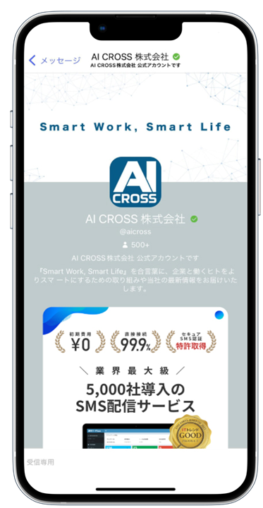 メッセージ送信元は企業名やサービス名を設定でき、認証バッジが付与されます。キャリアにて認証を受けた企業のみが利用できるため、なりすましの心配が一切ありません。