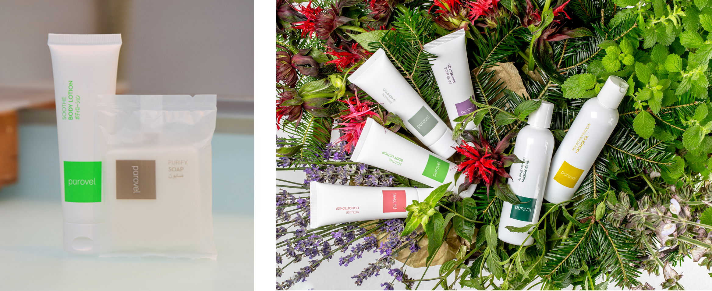 当ホテルが誇るピュロヴェルのバス製品、化粧品、マッサージオイルに、スイスの契約農家が手間ひまをかけて丁寧に栽培した植物から抽出したエッセンシャルオイルを使用しているのは、そのためです。自然の導きのもと、アルプス式ウェルネスというスイスならではの価値観を取り入れ、感覚を目覚めさせるピュロヴェルは、世界中のスイスホテルの客室やスパでご利用いただけます。