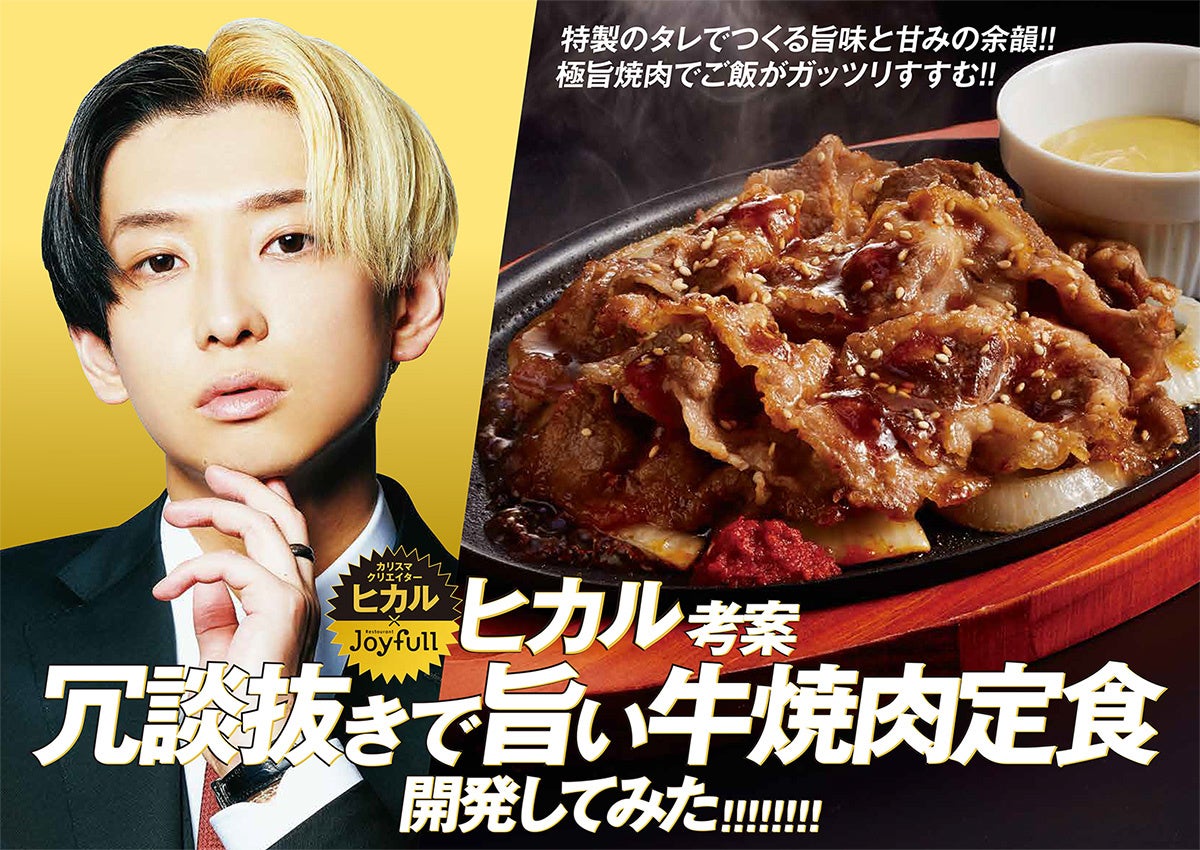 ファミリーレストランのジョイフル(運営:株式会社ジョイフル 本社:大分県大分市 代表取締役社長:穴見くるみ)は、2022年7月12日(火)15時より、カリスマクリエイター ヒカルさんとのコラボレーション商品第4弾「ヒカル考案 冗談抜きで旨い牛焼肉定食」を全国のジョイフル店舗にて販売開始する事をお知らせします。