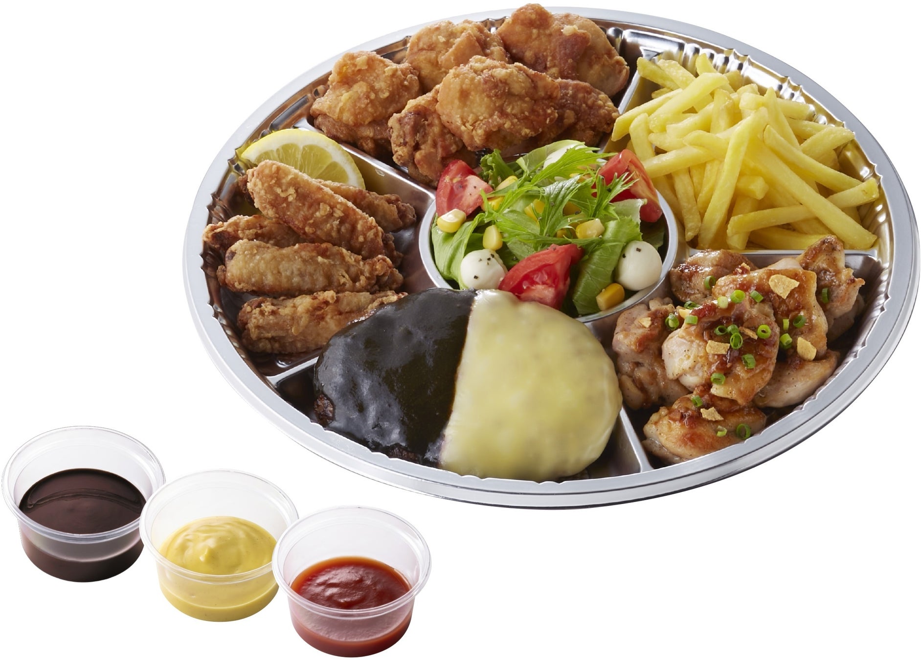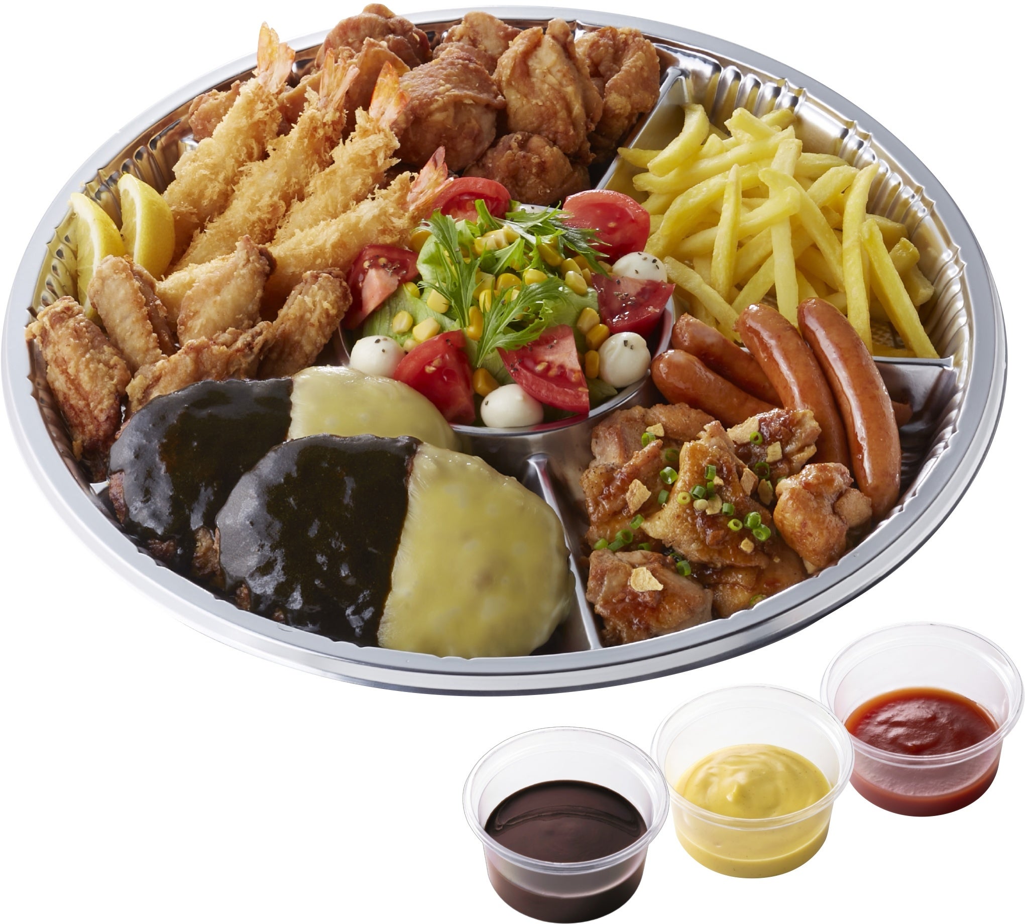 ・えびフライ・ソーセージ・ひとくちチキンステーキ にんにく醤油・イタリアンチェリーモッツァとトマトのサラダ・ポテトフライ(180g)