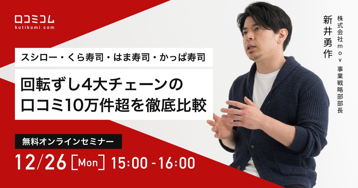 口コミサイトを”もっと”売上に変える、AI店舗支援SaaSを運営する株式会社mov(代表取締役:渡邊 誠、本社:東京都渋谷区、以下mov)は、飲食店の店舗ビジネスご担当者様を対象としたセミナー「【スシロー・くら寿司・はま寿司・かっぱ寿司】回転ずし4大チェーンの口コミ10万件超を徹底比較」を開催いたします。