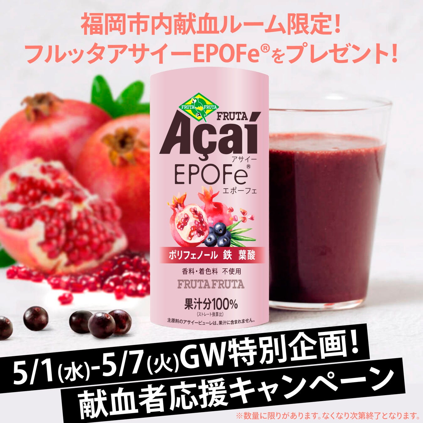 株式会社フルッタフルッタ(所在地:東京都千代田区 社長:長澤 誠)は、福岡県赤十字血液センターの献血ルームとの取り組みとして、2024年5月1日(水)から5月7日(火)の期間、福岡市内の3か所の献血ルームにて、アサイードリンクを提供するキャンペーンを行います。
