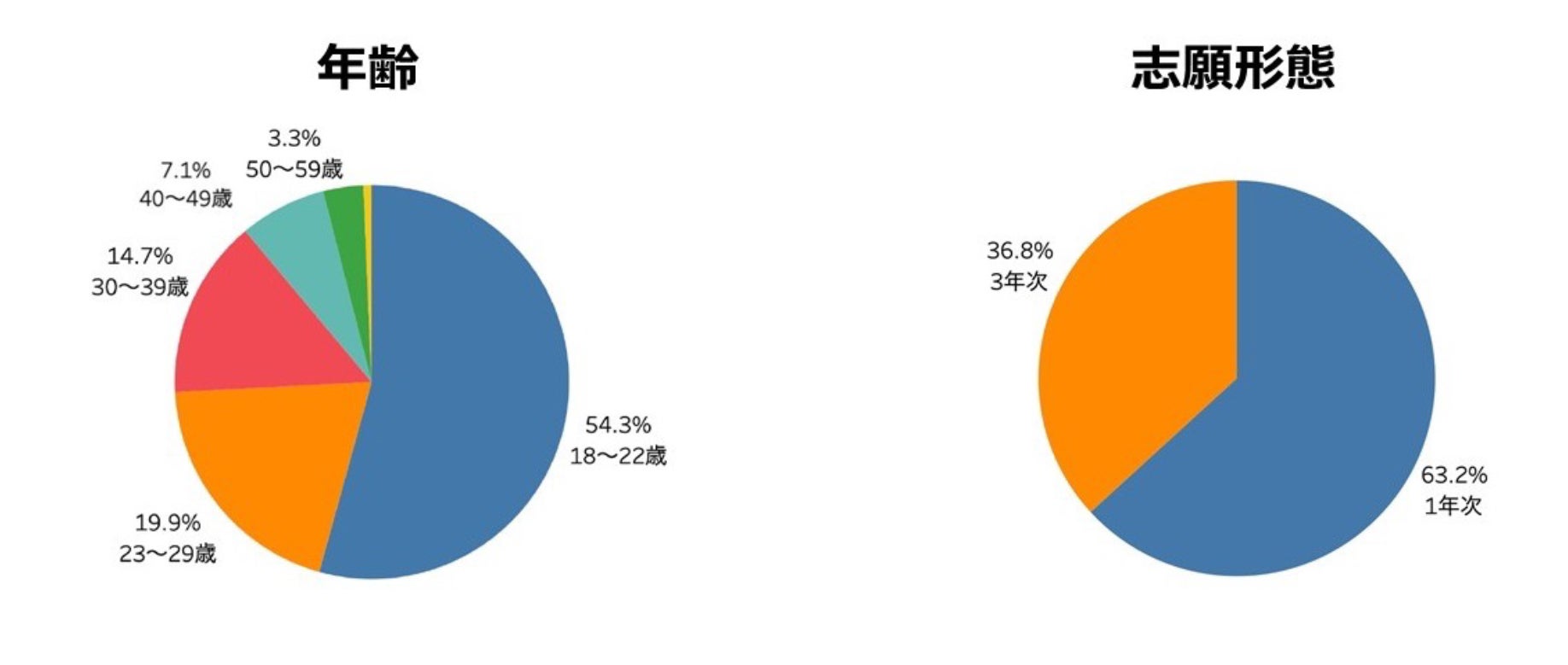 本コースでは他のコースと比較して1年次入学の割合が多く、10代もボリュームゾーンの年齢層となっております。高校生向けイベント等で注目を集めた結果、高校を卒業したばかりの18歳の割合も増加いたしました。高校卒業後の進路として通信制大学が注目される中で、本コースが選択肢のひとつとして選ばれていることがわかります。