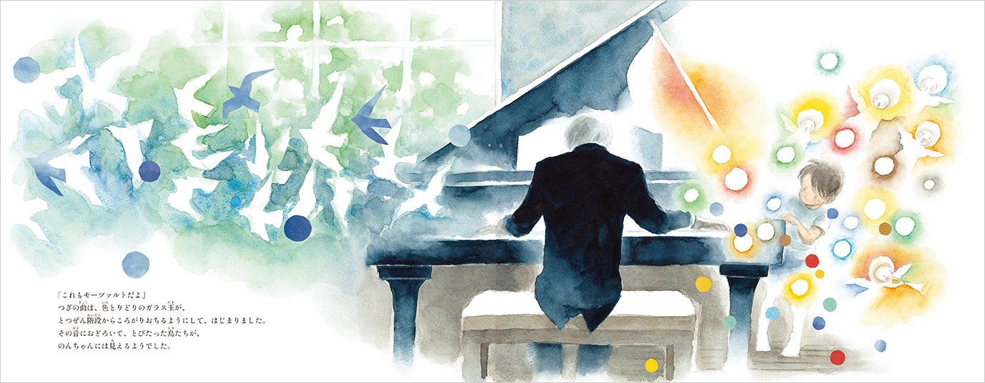 ▲おじいさんがのんちゃんのためにピアノを弾くシーン。鍵盤からあふれる音の表現が、読者をゆたかな音色で包み込みます。