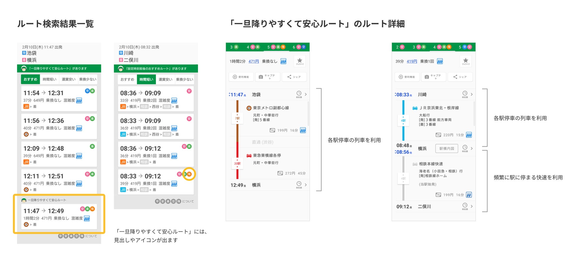 以前より電車での移動において、「体調面で長い時間停まらない電車は不安を感じる」「子ども連れの移動で急に途中下車したい時がある」といったお声が多く、このような場合、少し時間がかかっても一時的に電車を降りやすい各駅停車を利用される方が多いと思います。しかし降りやすくてもすべて各駅の場合は時間がかかりすぎて選びにくい場合や、また各駅に停まる列車だけでなく、他路線の途中駅を通過する急行などのほうが各駅停車より次の停車駅までの乗車時間が短いこともあります。このことを受け、今回、停車駅間の乗車時間に着目し、移動全体の所要時間などを考慮した「一旦降りやすくて安心ルート」の開発に至りました。