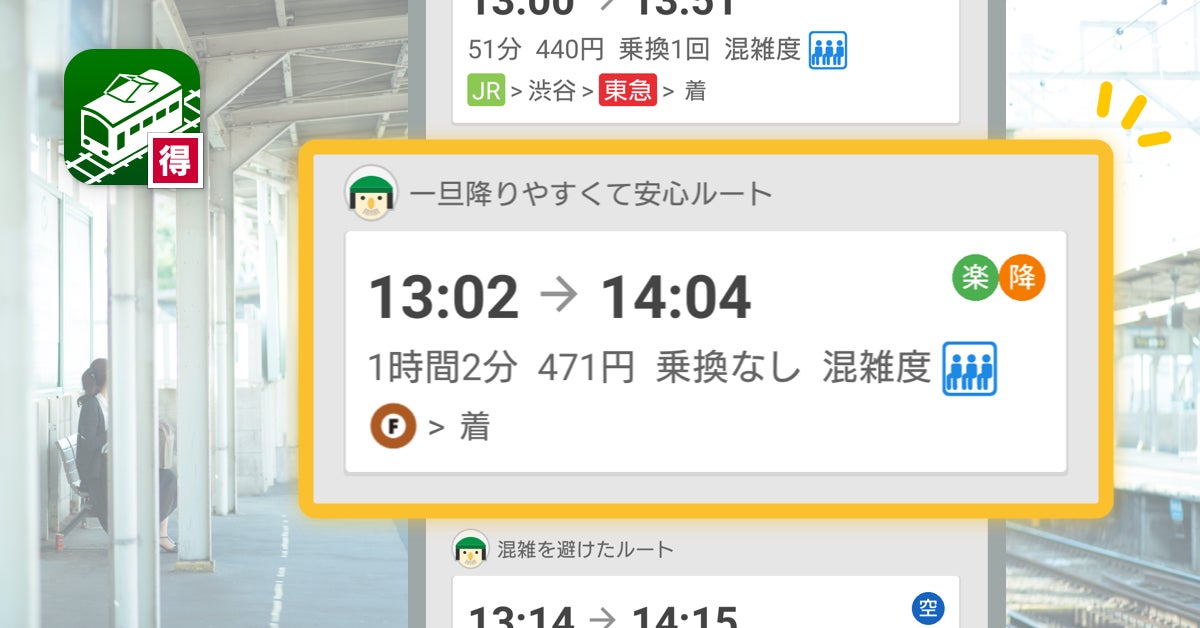 『乗換NAVITIME forスゴ得』にて、「一旦降りやすくて安心ルート」を提供開始