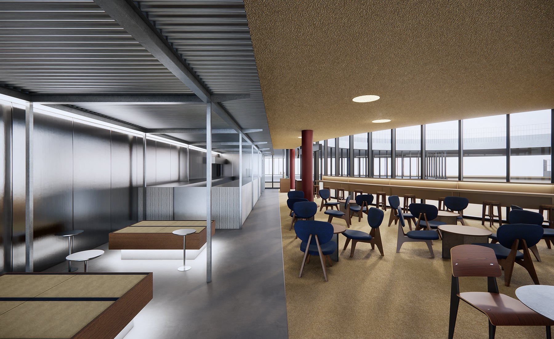 人々の熱気や興奮、高揚感を地続きに店内に引き込めるよう、スタジアムのグラウンドや広場と同色の土を想起させるマテリアルを使用。店内に建築した全長約17mの金属製の小屋は、公園における〝東屋〟のような存在として、屋外のような開放感を表現。畳とアルミ・木製・スチール製などの相反する要素が共存し、”懐かしくも新しい”空間を演出しました。厳選したスペシャルティコーヒーをはじめ、広島店限定ドリンクや、テイクアウトにも最適なホットサンドやスイーツなど幅広いメニューをご用意し、心彩るひとときをお過ごしいただける空間を提供いたします。