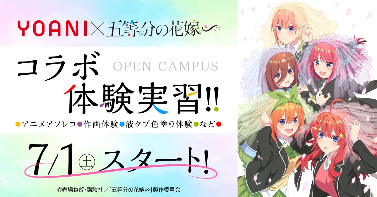 「五等分の花嫁」シリーズの映像を用いてのアフレコや、キャラクターの作画、液晶ペンタブレットを使用した色塗りなどの授業を体験できる「コラボオープンキャンパス」を、7月よりスタート予定です。