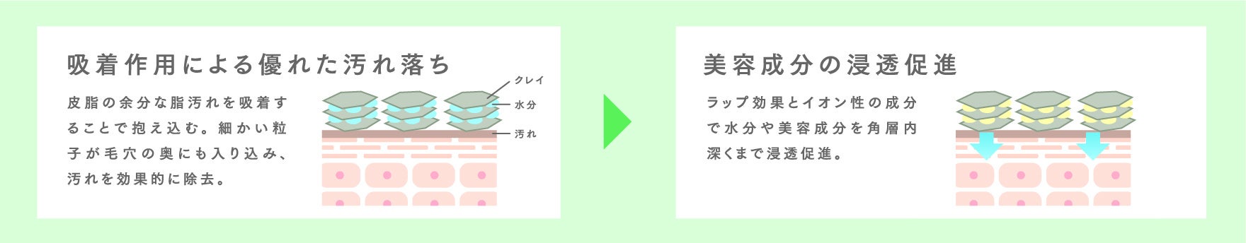 クレイの吸着力が、毛穴の汚れや古い角質を吸着しながらやさしく除去