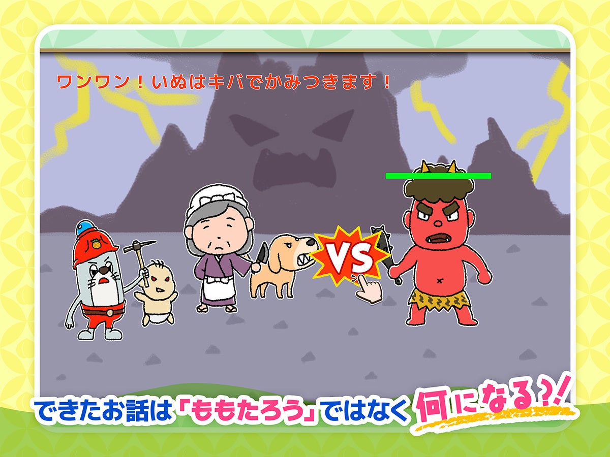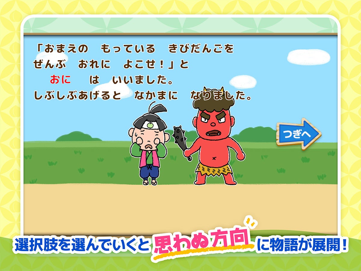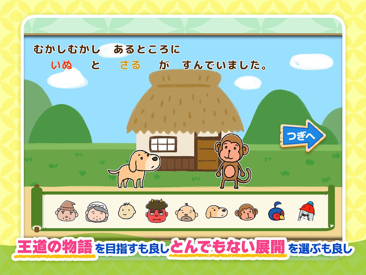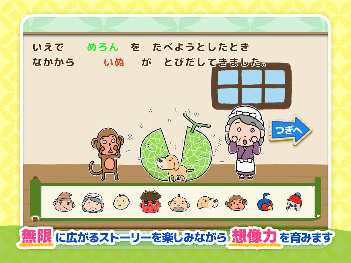 このアプリでは「桃太郎」の登場人物やシーンをプレイヤーが自由に選択して、オリジナルのストーリーを作って楽しめます。王道のストーリーを目指して選択肢を選ぶも良し、わざと変な選択肢を選んでみるのも良し、遊び方は自由自在。あらかじめ決められたお話の流れに縛られず、無限に分岐が広がっていくストーリーを通じて、子どもたちの想像力をはぐくみます。
