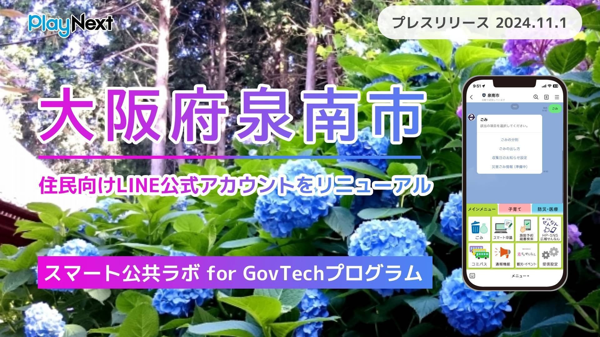 プレイネクストラボ株式会社(本社:東京都品川区、代表取締役:柏 匠、以下 「プレイネクストラボ」)の提供する「スマート公共ラボ for GovTechプログラム」が、大阪府泉南市(以下「泉南市」)のLINE公式アカウントに採用され、2024年11月1日(金)より一般公開したことをお知らせします。
