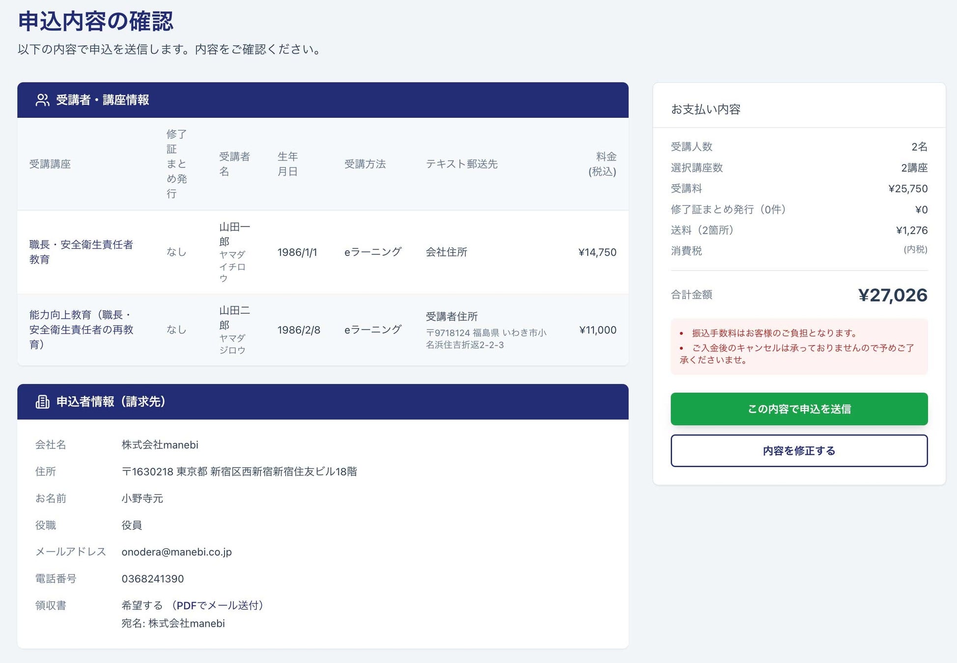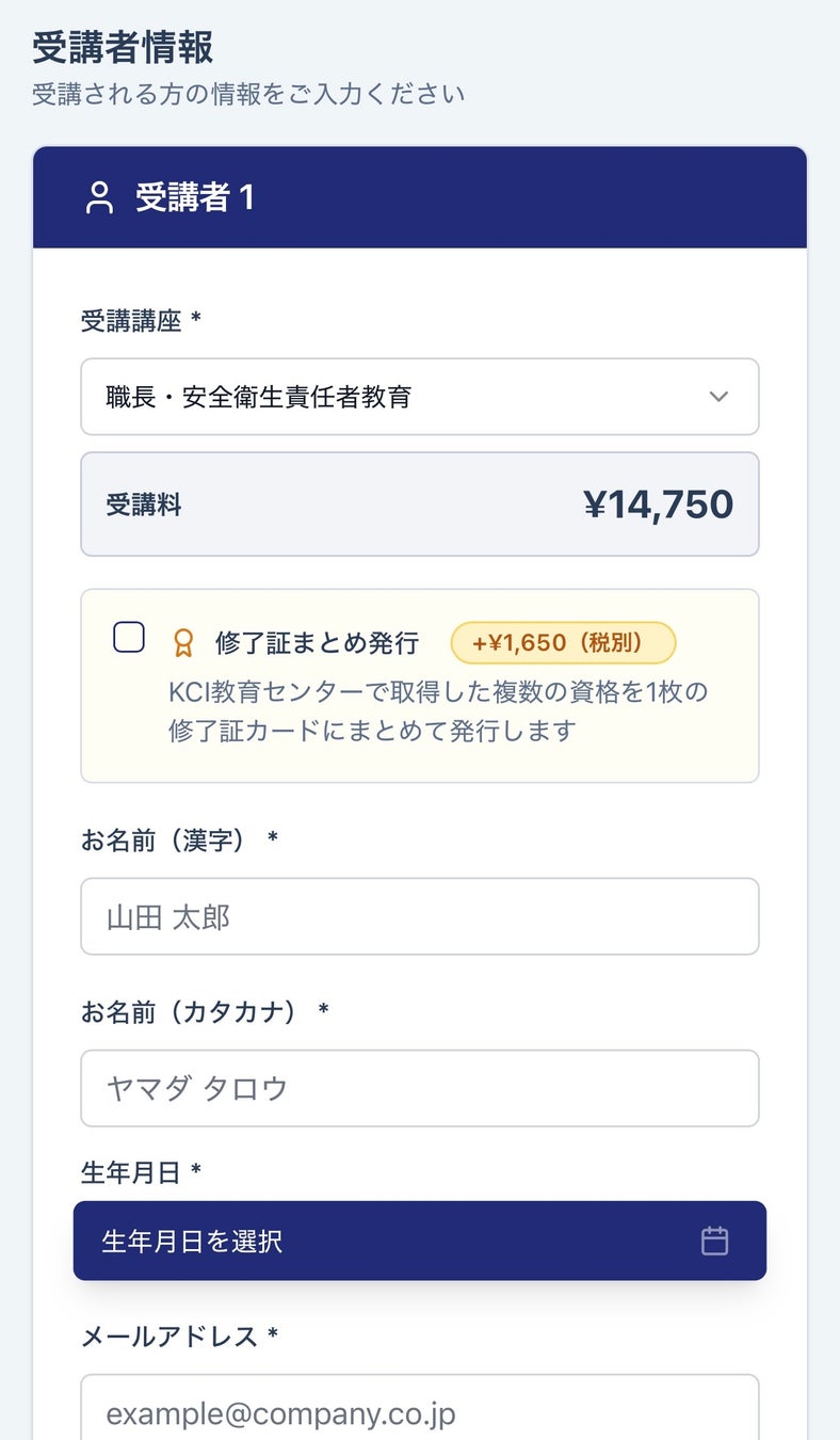 複数名の一括申し込みに対応: 従業員様分をまとめて申し込む際の操作性を大幅に向上させました。受講者情報の入力フォームを見直し、多人数分の登録も迷わずスムーズに行えるよう改善しています。
