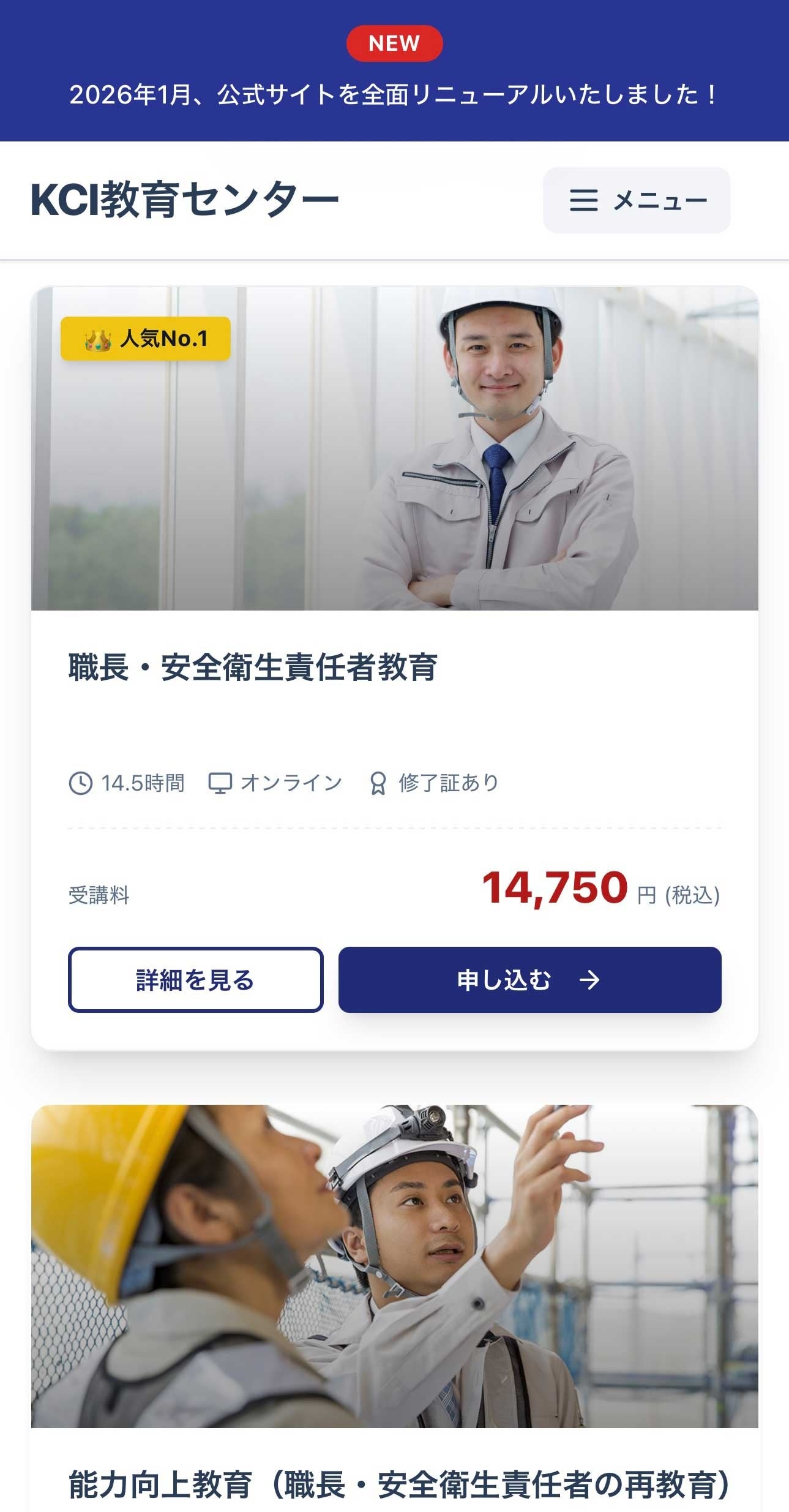 建設業界特化型 オンライン研修サービス「KCI教育センター」を運営する株式会社manebi(本社:東京都新宿区、代表取締役:田島智也)は、ご利用者様の利便性向上を目的として、2026年1月21日(月)に「KCI教育センター」のサービスサイトを全面リニューアルいたしました。