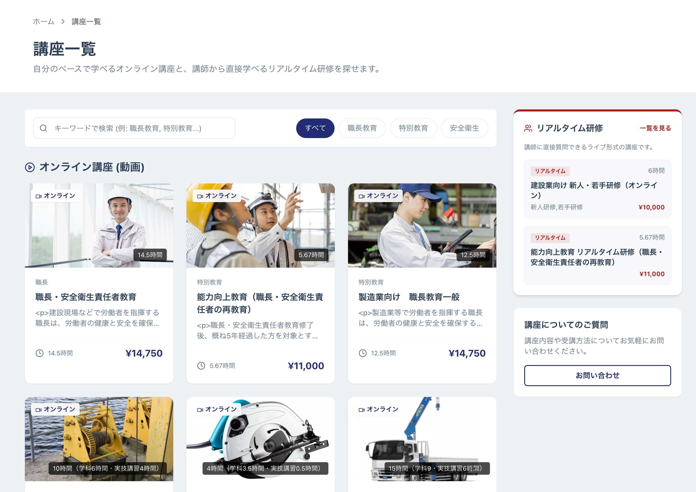 トップページのデザインを一新し、講座一覧では「職長教育」「特別教育」「リアルタイム研修」など、目的別にカテゴリを整理しました。また、絞り込み検索機能を強化し、ご自身に必要なカリキュラムを即座に見つけられるようになりました。