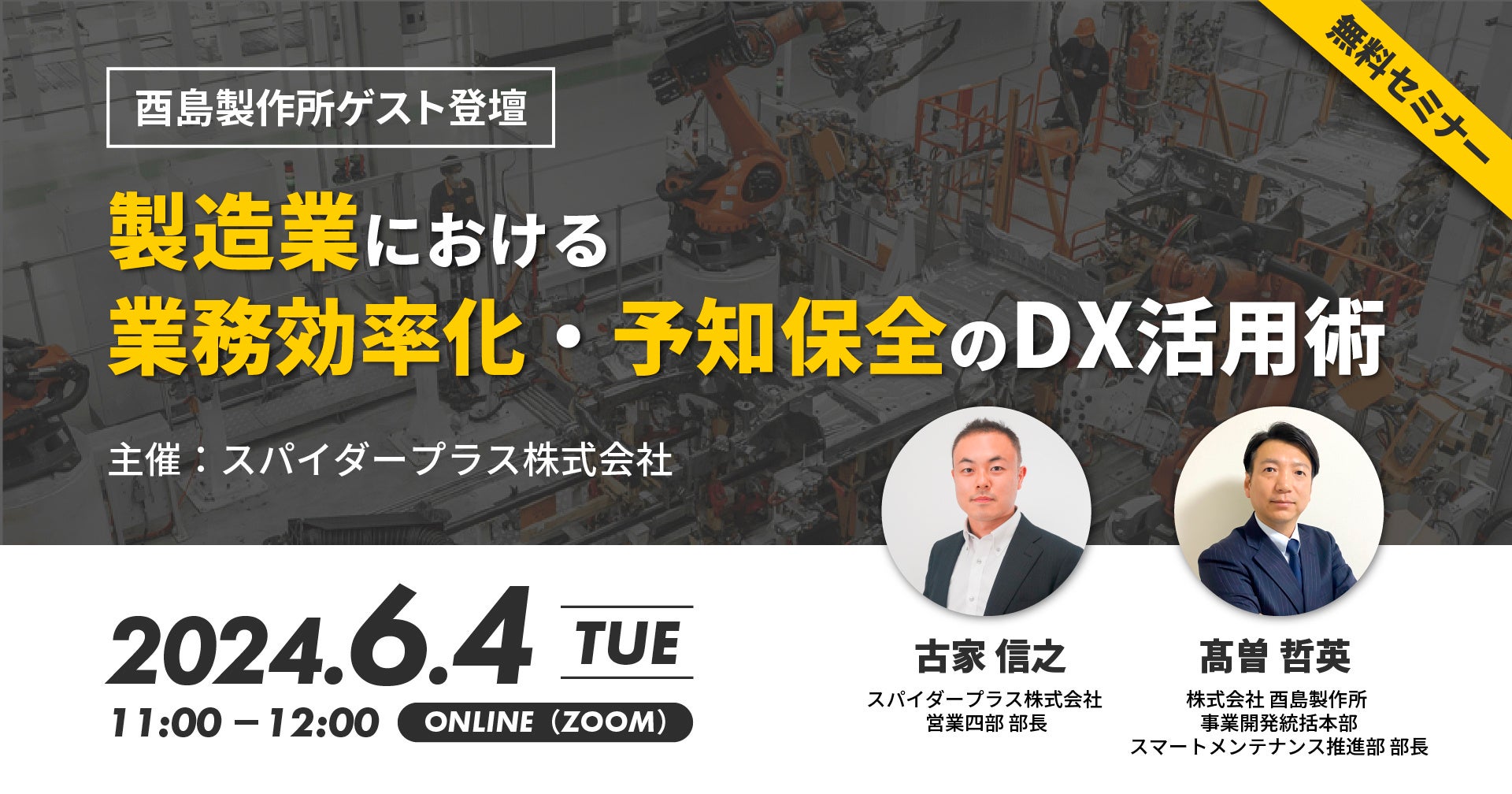 スパイダープラス株式会社、【酉島製作所ゲスト登壇】『製造業における業務効率化・予知保全のDX活用術ウェビナー』開催のお知らせ(2024年6月4日)