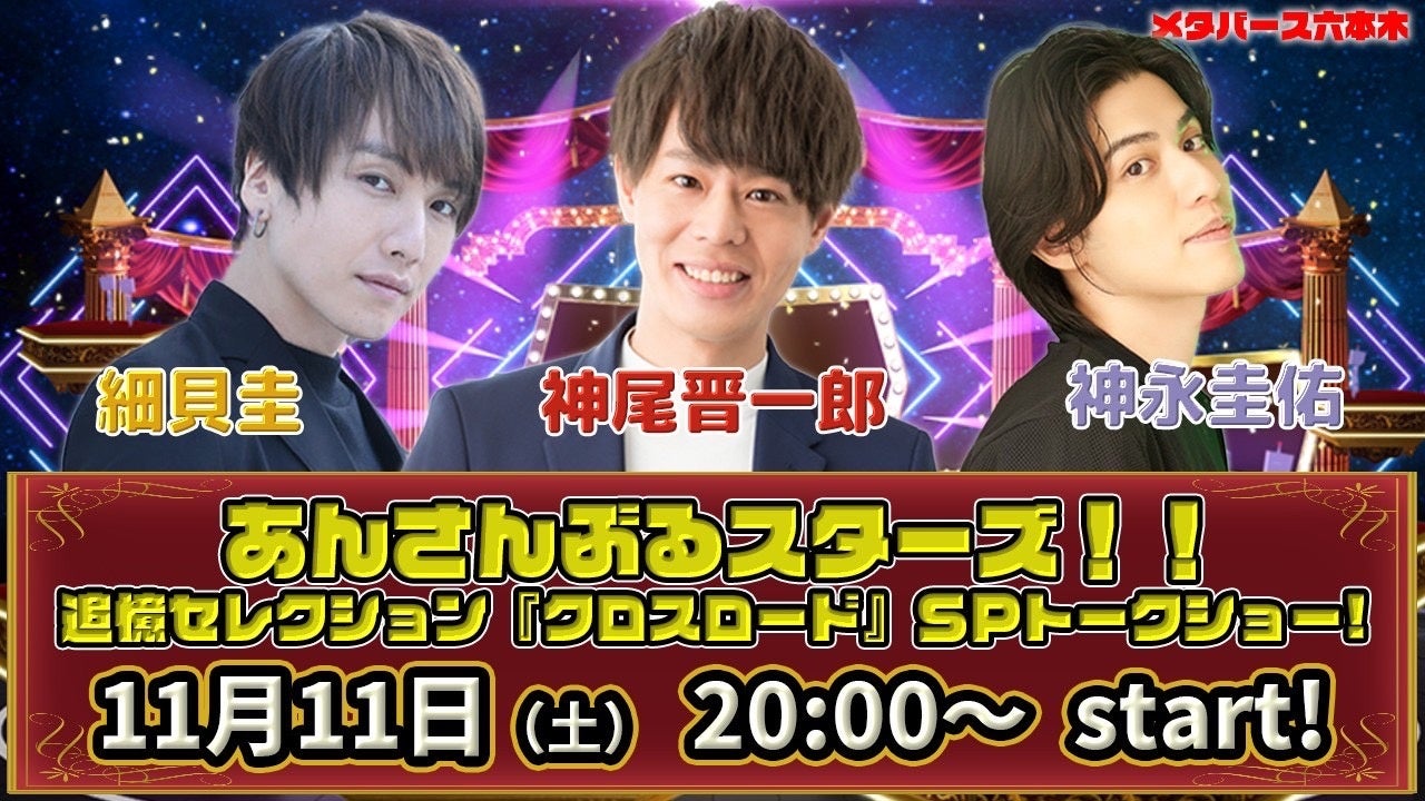 『あんさんぶるスターズ!!』の新作アニメ、追憶セレクション『クロスロード』で声優を務める、神尾晋一郎、神永圭佑、細貝圭がメタバース空間に集うSPトークイベントです!!11月11日(土)夜8時から、参加費は無料。メタバース六本木にて、先着1000名様限定、生配信で行われます。