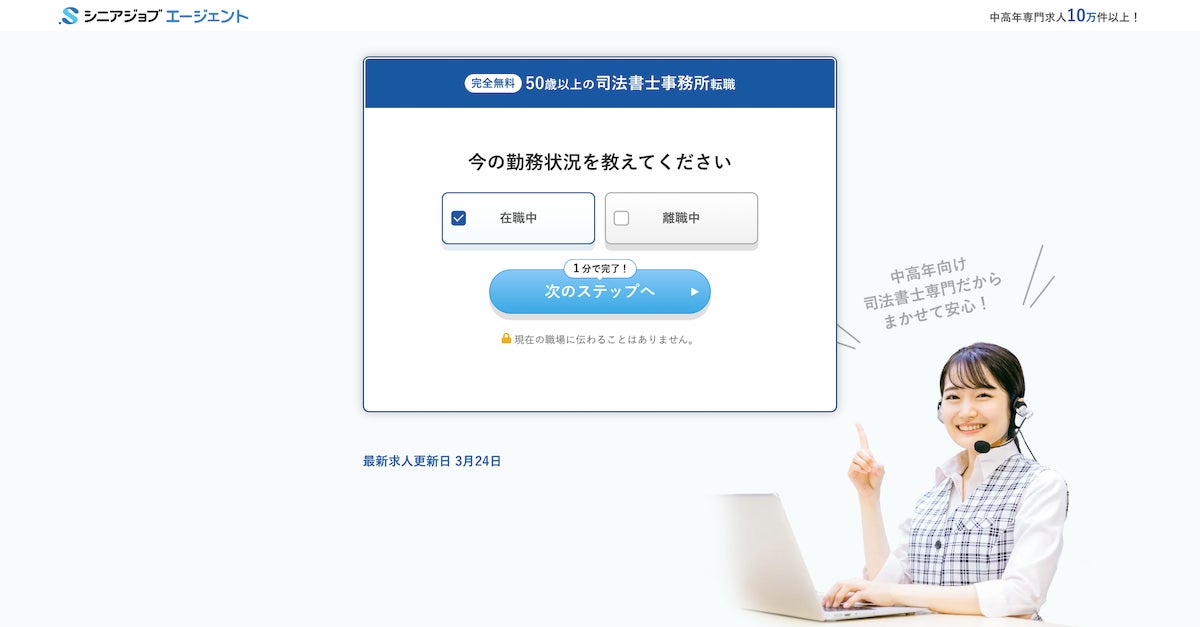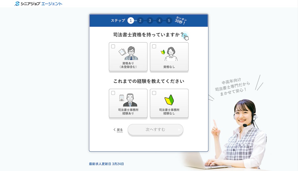 人材紹介 「シニアジョブエージェント」の司法書士の専用登録ページ(https://senior-job.co.jp/judicial_scrivener-slp3)は、5つのステップのみ、約1分程度で登録できるシンプルで簡単なものとなっています。