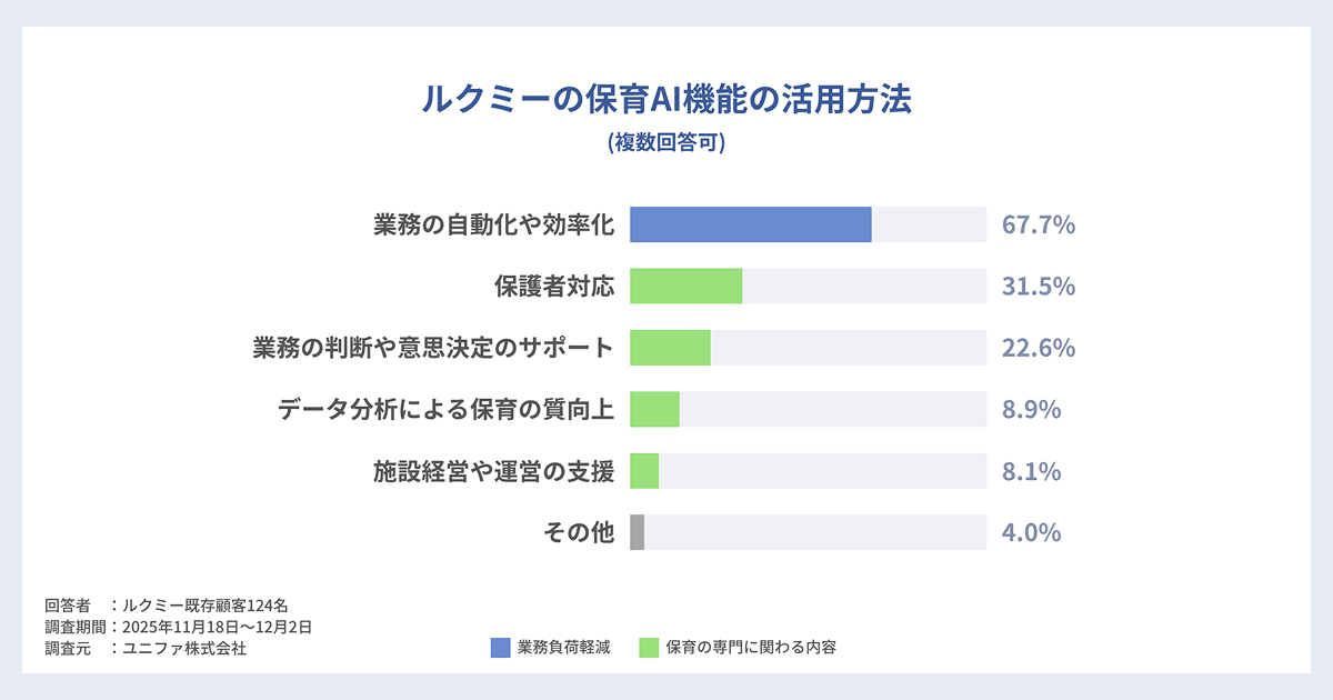 汎用AIへの依存割合が浮き彫りになる中、ユニファが全国の既存顧客向けに実施した「第5回 ルクミー顧客調査※5(以下、前回調査)」からは、ルクミー導入園における先進的なAI活用の実態が明らかになっています。
