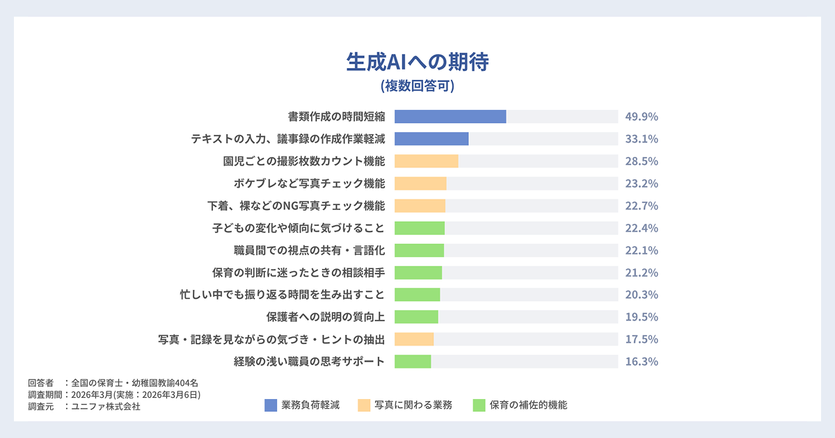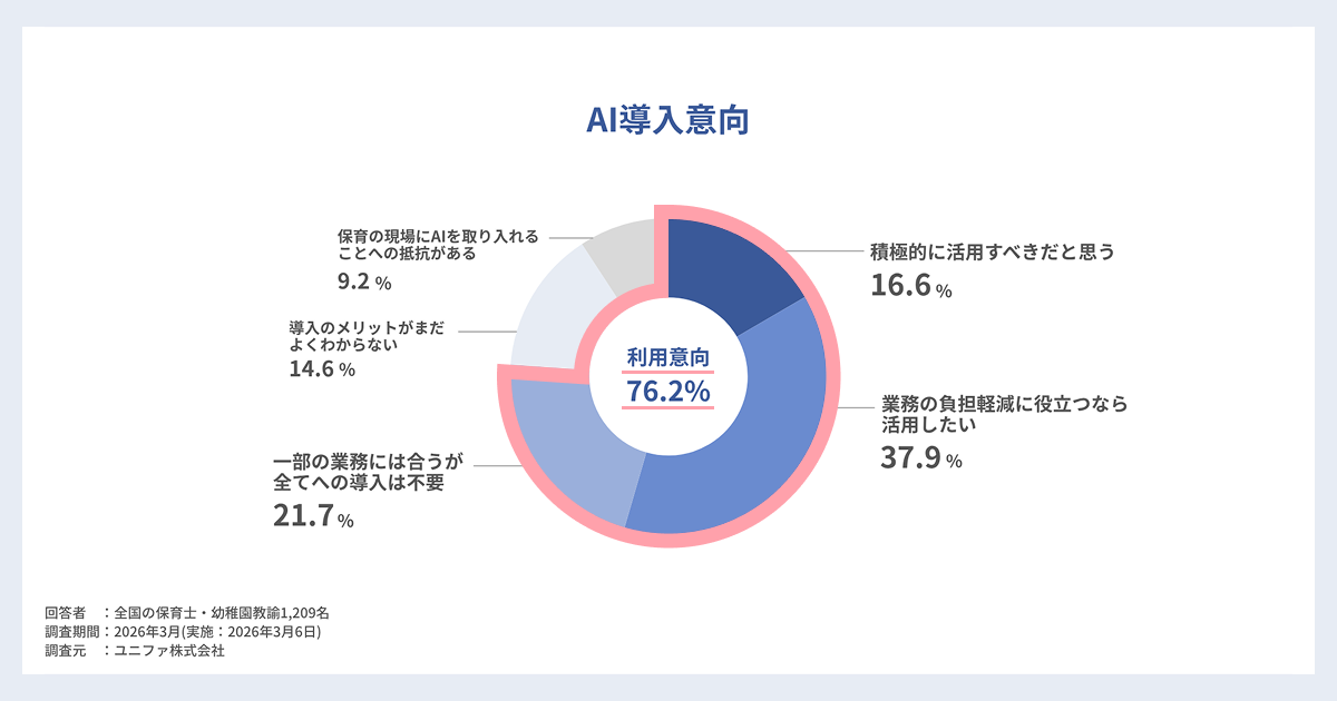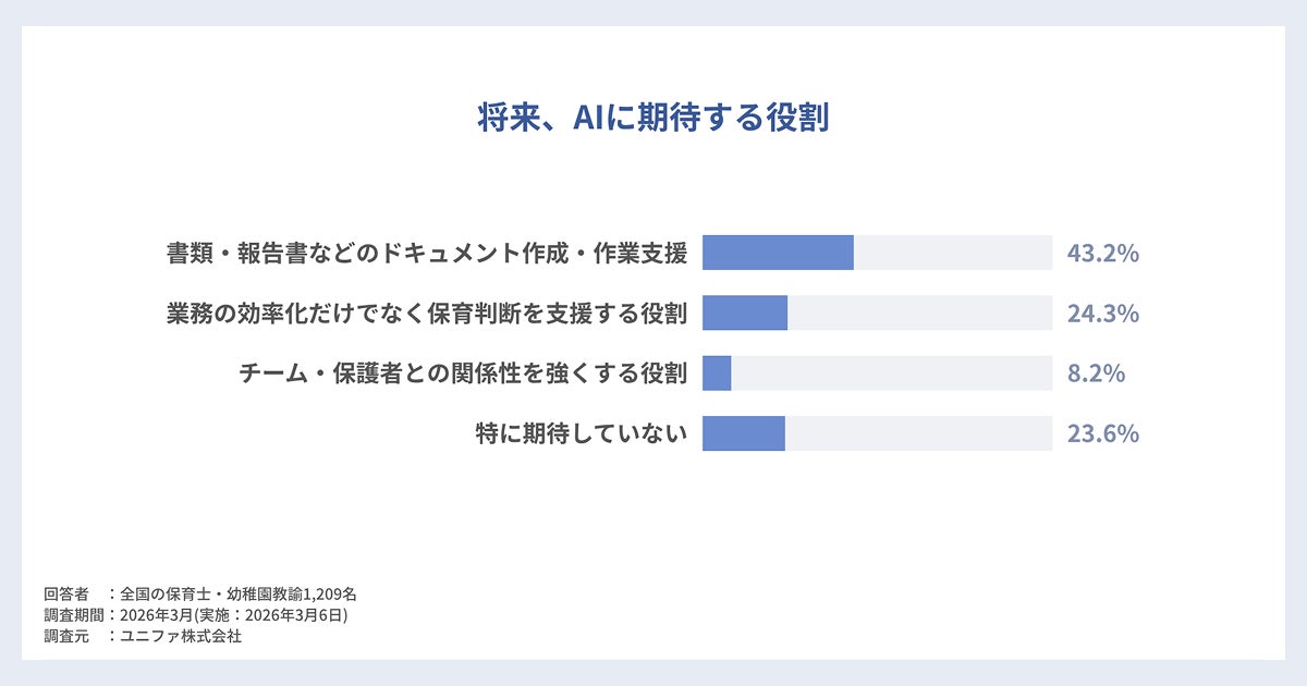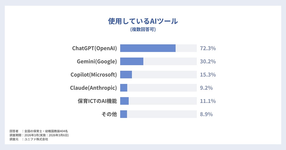 保育AI™を中心としたテクノロジーの力で保育や子育てに関する社会課題を解決するユニファ株式会社(本社:東京都千代田区、代表取締役CEO:土岐泰之、以下「ユニファ」)は、全国の保育士・幼稚園教諭など1,209名を対象にした「保育士・幼稚園教諭のAI活用に関する実態調査 2026」(以下、「今回調査」)を2026年3月実施しました。
