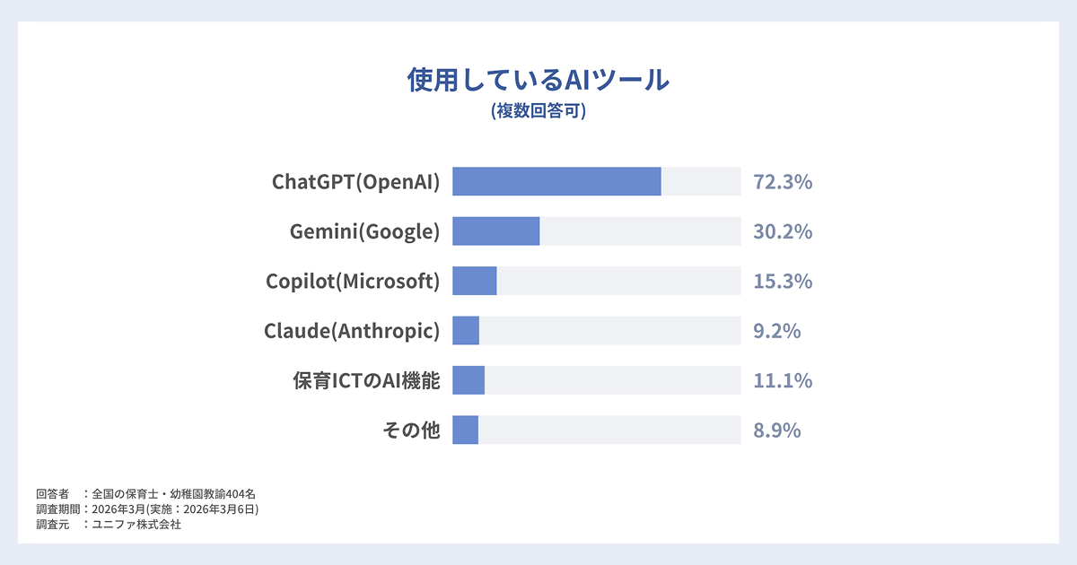 生成AIツールは、7割以上(72.3%)がChatGPTなどの汎用AIを利用。保育業務に特化したAI機能の認知度は低い