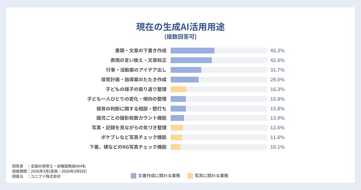 アンケートに回答した保育士・幼稚園教諭・保育関係者の33.4%(404名)がAIの利用経験有り。用途は「書類作成・文書・文章の下書き作成(45.3%)」や「表現の言い換え・文章校正(42.6%)」などのテキスト生成に集中している。(表1)