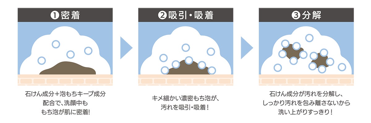 従来の泡洗顔*4の約3倍となる石けん成分を高配合*4することで、これまでにない*4泡もちの良さ、泡弾力、洗い上がりのすっきり感を実現しました!弾力のあるキメ細かい濃密もち泡が肌に密着、汚れを吸引・吸着して、肌悩みの原因となる皮脂や古い角質をしっかりオフ。うるおうのにすっきりとした洗い上がりです。