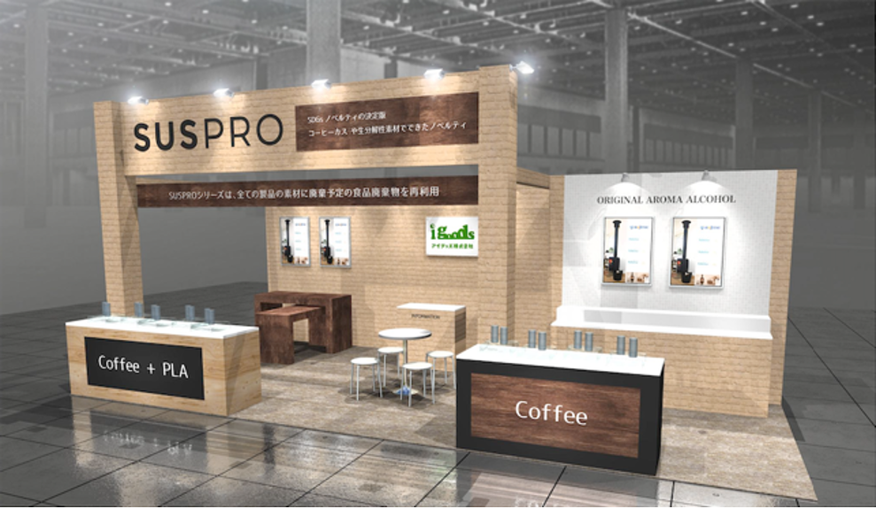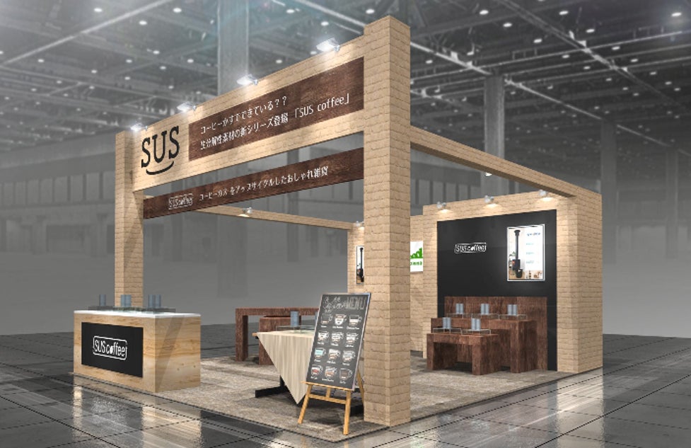 当社展示内容:SUS coffeesシリーズ(コーヒーかす・PLA樹脂を掛け合わせた新商品)など
