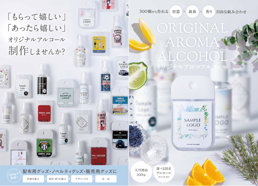 さらに、同ブースにて新しい感染対策を実現できる匂い付き除菌アルコールも発表いたします。現在、手指の消毒・除菌は人々の「習慣」として定着しています。除菌が欠かせない時代となった今、通勤・外出時・仕事中いつでもどこでも使用できるオリジナル除菌アルコールの需要が増えています。当社ではブランドイメージに沿ったオリジナルの容器、液体・アルコール濃度、アロマをフルカスタマイズで選ぶことができ、さらにラベルには企業ロゴを施すことでオリジナル除菌アロマアルコール製作が可能です。アルコールは国産品で、手にした方も安心して使用できます。