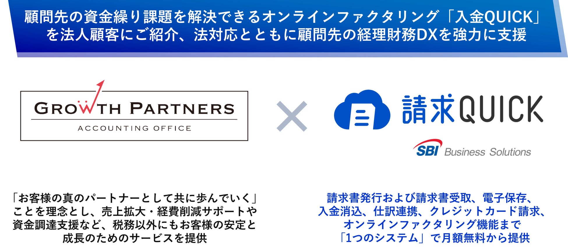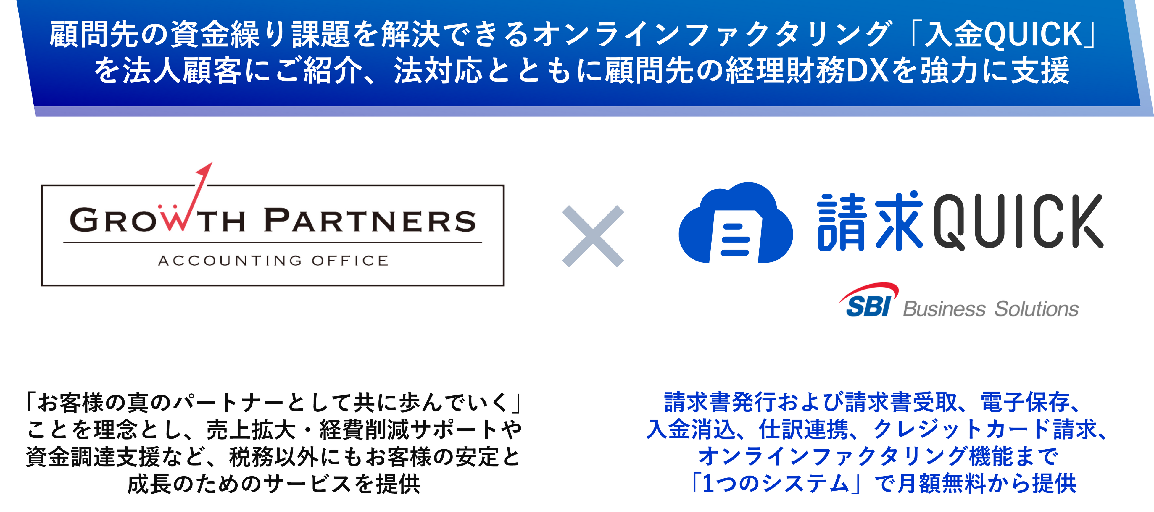 総合フィンテックソリューション企業であるSBI FinTech Solutions株式会社の子会社で、バックオフィス支援サービスを提供するSBIビジネス・ソリューションズ株式会社(本社:東京都港区、代表取締役社長:夏川 雅貴、以下「当社」)は、経理のさまざまな課題を解決し、DXを加速するクラウド型請求書管理システム「請求QUICK」におけるパートナープログラムにおいて、GrowthPartners(グロースパートナーズ)税理士法人(本社:東京都中央区、代表社員 税理士:山岸 秀地、以下「グロースパートナーズ」)にご参加いただきましたのでお知らせいたします。