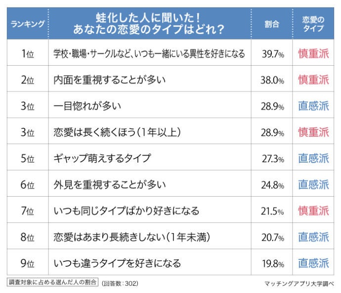 逆に、8位の「恋愛はあまり長続きしない(1年未満)(20.7%) 」、9位の「いつも違うタイプを好きになる (19.8%)」は、いわば「直感で恋愛をするタイプ」と言えます。