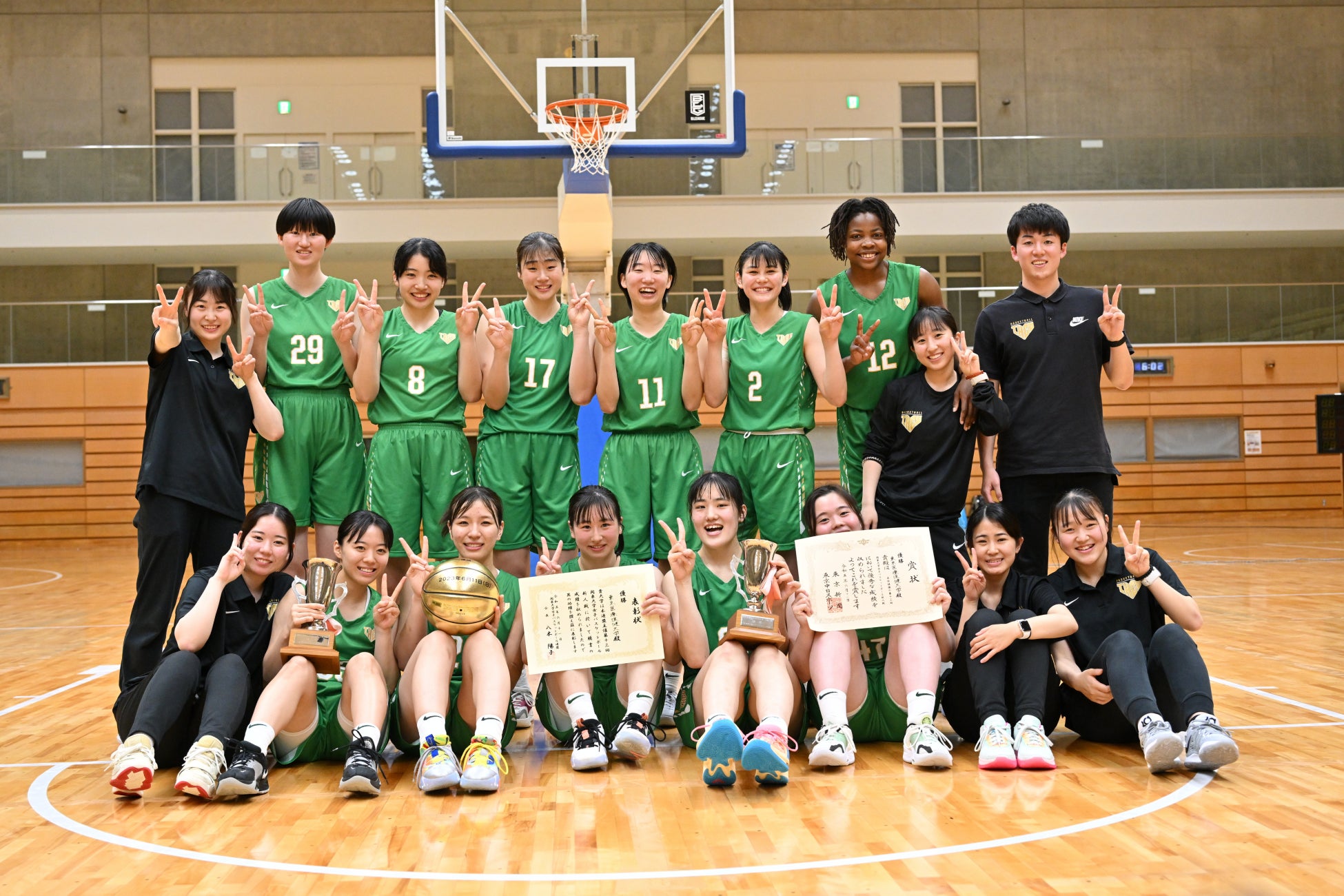 今年度は、選手6名、スタッフ3名の1年生を迎え、2年生5名を含めた11名で新人戦に挑みました。決勝戦では白鷗大学と対戦し、序盤から接戦が繰り広げられる中、大脇晴選手(2年生)が中心となり得点を重ねた結果、73-65の8点差で勝利しました。また、決勝戦でチーム最多の29点を得点した大脇選手は、本大会の最優秀選手として表彰されました。