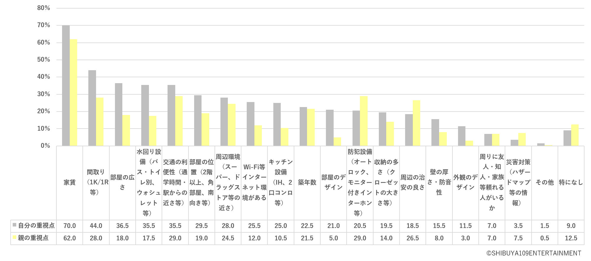 次に、部屋の重視点における本人と親の違い※図2について聞いたところ、本人は「家賃(70.0%)」や「間取り(44.0%)」「部屋の広さ(36.5%)」を重視しているのに対し、親は「家賃(62.0%)」に続き「防犯設備(29.0%)」を重視しており、親の方がより一層安全を気にして家探しをしていることが伺えます。