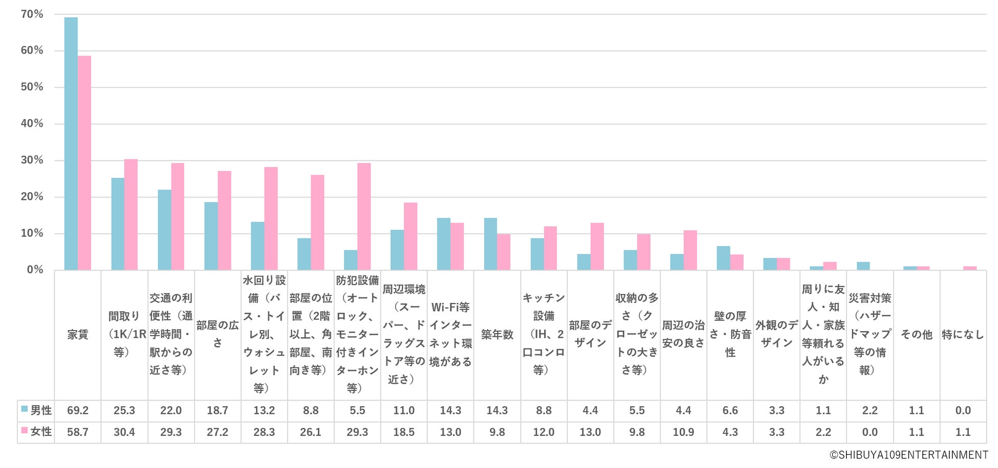 では、最終的にはどのような点で物件を決めたのでしょうか。今住んでいる物件の決め手となった点※図3について聞いたところ、男女の違いが見られました。男性は、「家賃」が約70%と圧倒的に高く、他の項目は低い結果となり、こだわりが少ないようです。一方女性は、同じように家賃が決め手の1位となりますが、「間取り」「交通の利便性」「部屋の広さ」「防犯設備」など男性よりも高い項目が多く、総合的に部屋の良し悪しを見て決めているようです。