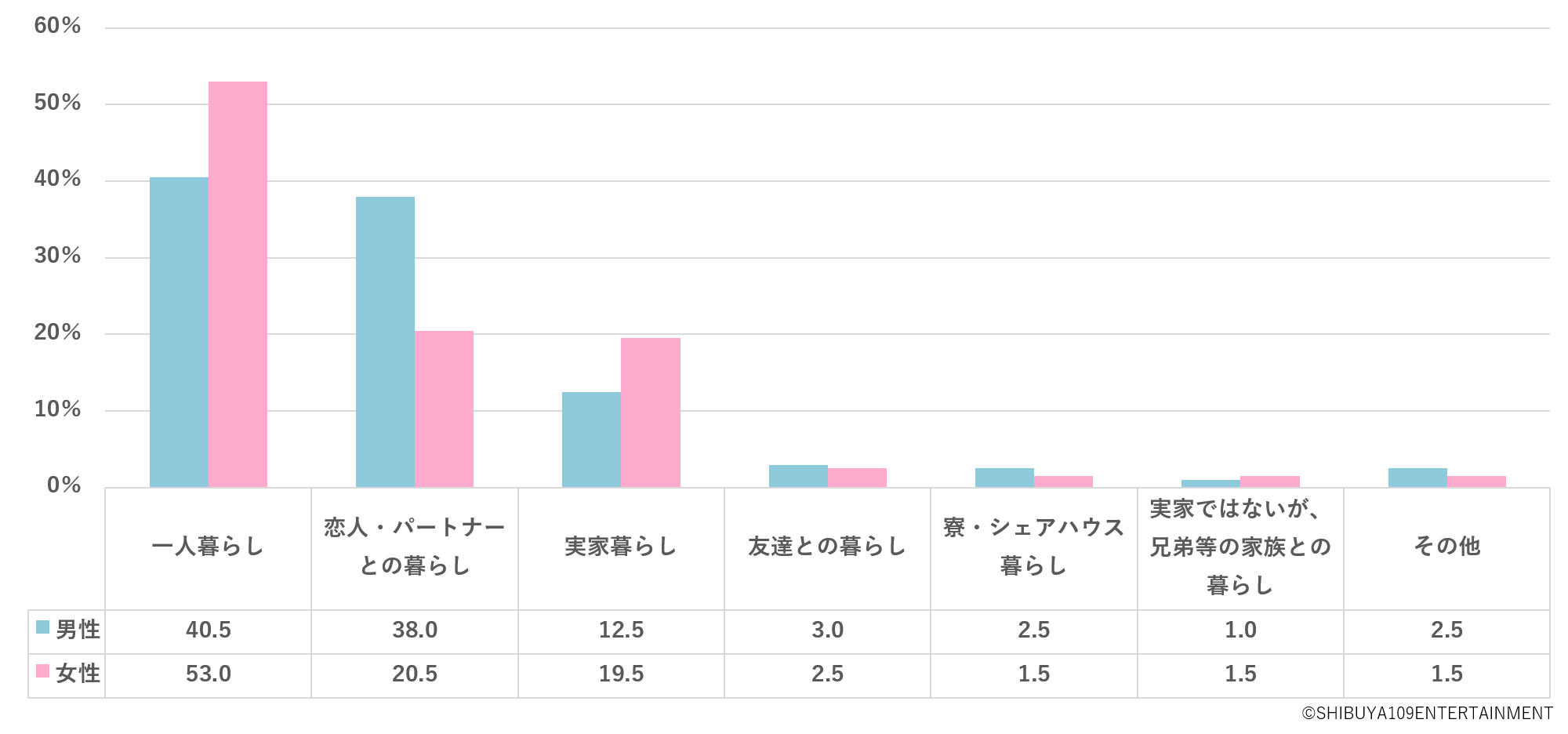 理想の暮らし方※図5に関しても、男女で違いが見られました。女性は、約半数が「一人暮らし(53.0%)」を希望するなど圧倒的に一人暮らしへの憧れが強く、続いて「恋人・パートナーとの暮らし(20.5%)」「実家暮らし(19.5%)」を理想の暮らしとしています。一方、男性は「一人暮らし(40.5%)」は女性よりも約10%低く、「恋人・パートナーとの暮らし(38.0%)」が女性の約2倍という結果となりました。