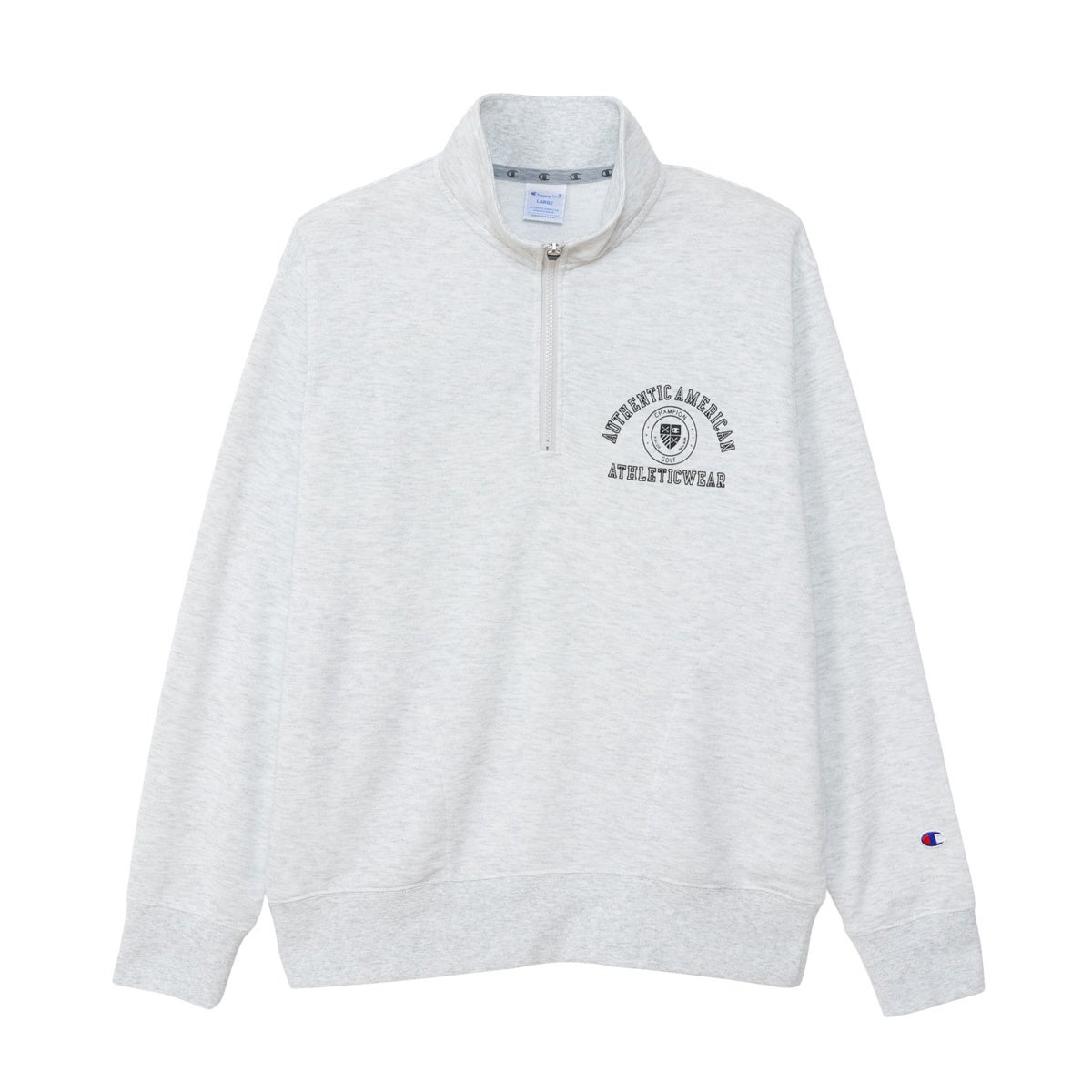 環境に配慮されたリサイクルポリエステル100%で、Champion®(チャンピオン)の歴史を感じるオーセンティックな裏毛編みのスウェット素材「Light Stretch Dry」を使用したTECH WEAVE®(テックウィーブ) テリー ハーフジップスウェットシャツです。コットンのようなソフトな肌触りと無骨ながら温かみと深みのある豊かな表情が特長で、ストレッチ性と吸汗速乾機能も備えています。着慣れた感覚で着用できる程良いリラックスフィットで、締めつけすぎないよう薄手に仕上げた手首のリブは、アドレス時に邪魔にならない少し長めの仕様です。両サイドは小物を入れるのに便利なポケット付き。胸には「AUTHENTIC AMERICAN ATHLETICWEAR(オーセンティック アメリカン アスレチックウェア)」と校章風のエンブレムを組み合わせたグラフィックを、背中には大胆に「CHAMPION」をラバープリントで入れています。