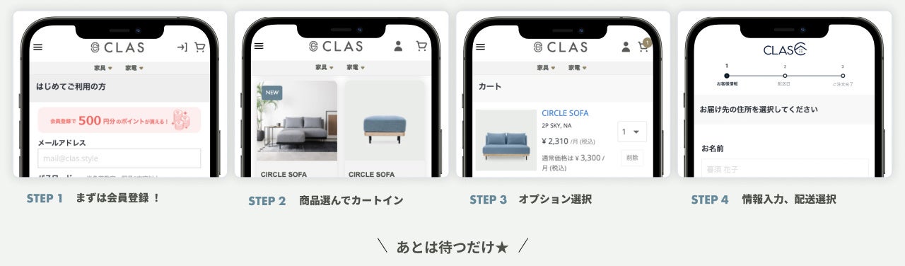 CLASのお客さまの70%は、ライフイベントとともに引っ越しを伴い、環境が変化しやすい20代〜30代(※CLAS調べ)です。暮らしの変化に合わせてCLASをより便利に活用いただけるよう、部屋のサイズに合わせてフィットする伸縮性やコンパクトなつくりと、どんなコーディネートにもマッチするシンプルなデザインで、シリーズすべて月額1,000円台の価格を実現しました。