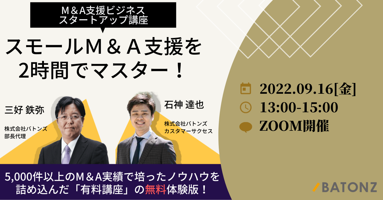 本セミナーは、過去5,000件以上のM&A支援実績をもとにバトンズが作成したスモールM&A実践講座(有料講座)の無料体験版です。本セミナーは8月5日に初回配信を行い、大好評いただきましたので、2度目の開催を決定いたしました。