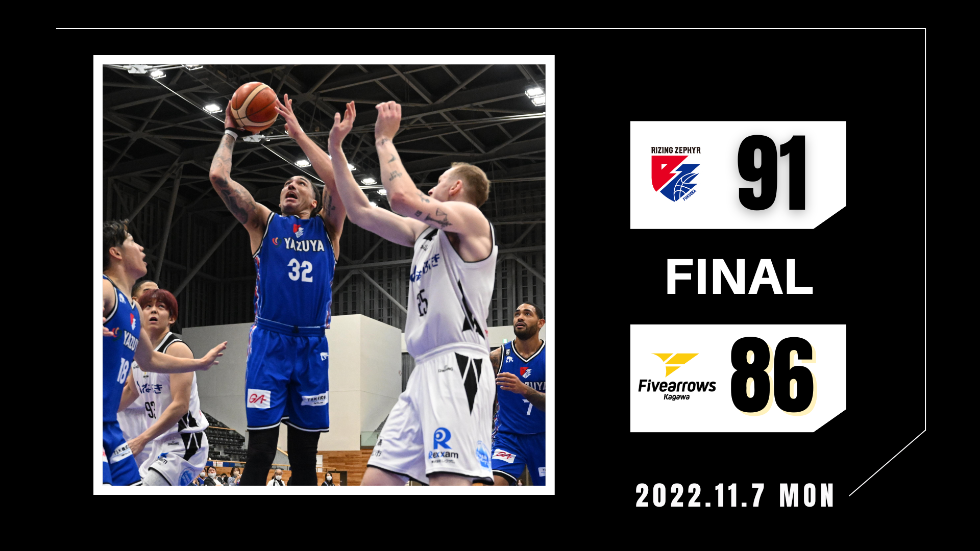 2022年11月7日(月)に開催されましたBリーグ第6節【ライジングゼファーフクオカvs.香川ファイブアローズ】において“福岡91-86香川”の結果となりましたことお知らせいたします。