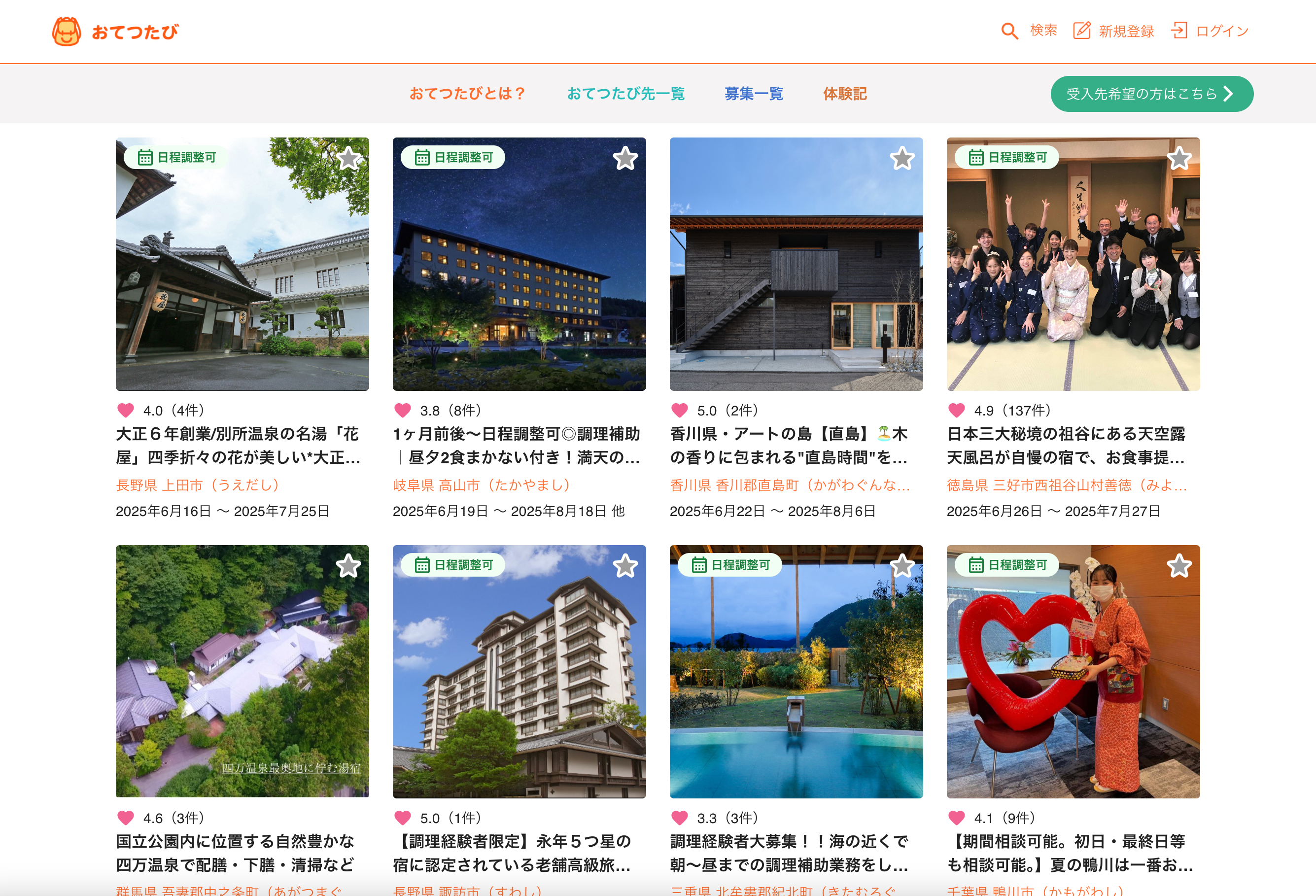おてつたびは、旅をしながら働きたい人と、人手不足で困っている地域の事業者さんをつなぐサービスです。地域外から訪れる助っ人に対して、報酬と宿泊場所(寮や空き部屋など)を用意することで、全国の応募者から必要な時期に人手を確保できます。2ヶ月未満までの自由な期間で求人掲載が可能です。必要なタイミングに合わせた募集が行えます。2025年5月現在、登録ユーザー数は7.8万人で、実際の参加者のうち約半数がZ世代です。近年では、早期退職や地方移住を見据えた50代以上の利用も増加しています。