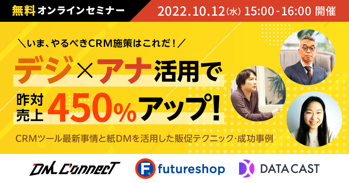 <10月12日(水)開催>いま、やるべきCRM施策はこれだ!「デジxアナ」活用で昨対売上450%アップ!CRMツール最新事情と紙DMを活用した販促テクニック・成功事例 大公開セミナー