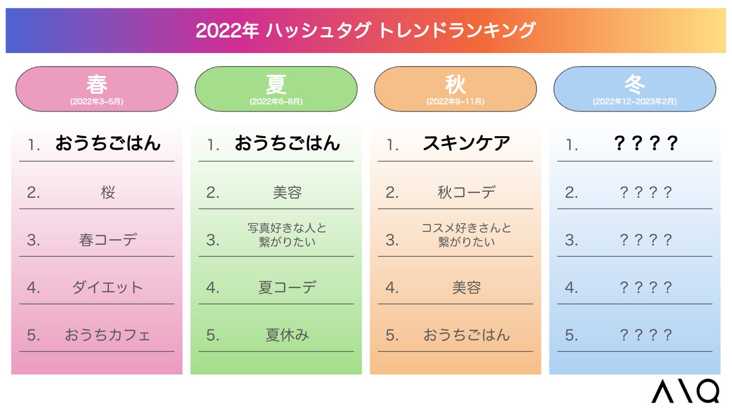 【AIを活用したInstagramのマーケティング支援を行うAIQ株式会社】2022年のハッシュタグトレンドを調査した「2022年春~秋のハッシュタグトレンドランキング」を公開!