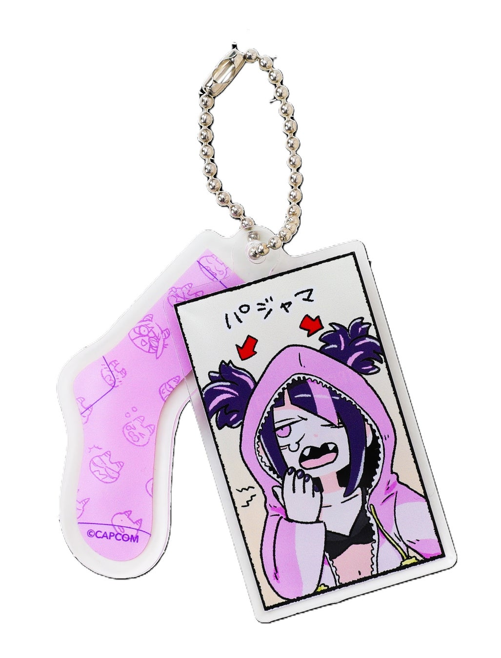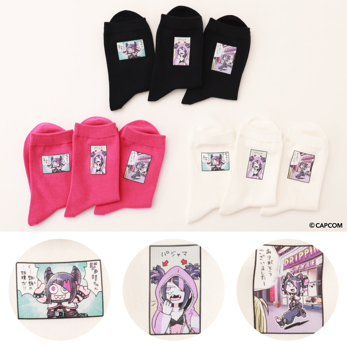 『ストリートファイター6』のキャラクター「ジュリ」を主役にしたコミカルな短編漫画「がんばれジュリちゃん」の1コマを、ベタソックスの側面にプリントしたソックスです。