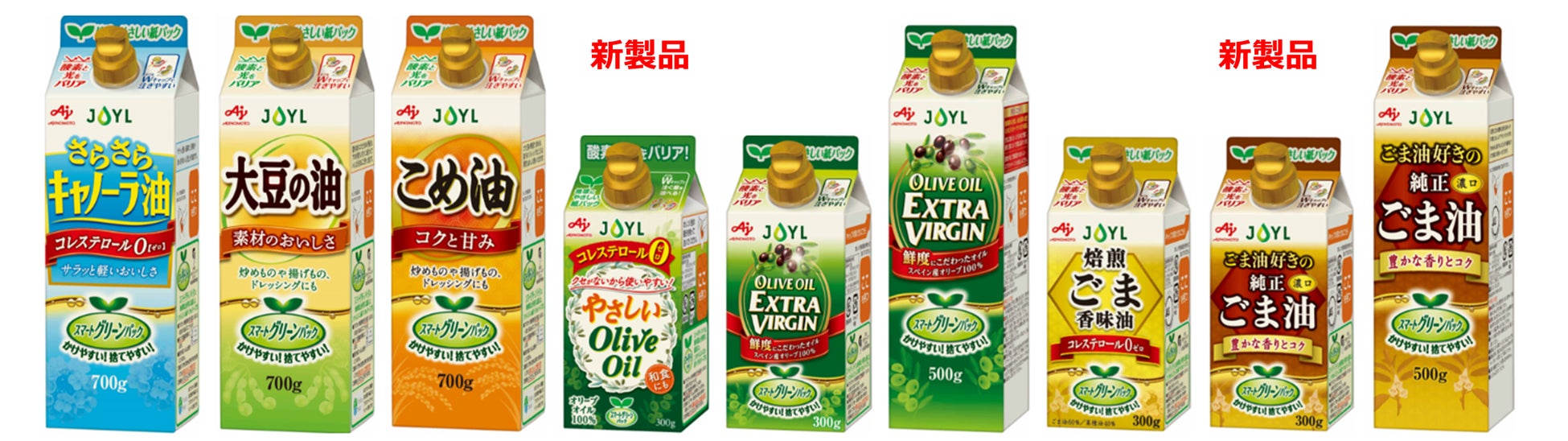 また新製品として、クセがなくさまざまな料理に使える“コレステロールゼロ”のオリーブオイル、JOYL「AJINOMOTO やさしいOliveOil」300gを同シリーズから全国で発売します。JOYL「AJINOMOTO ごま油好きの純正ごま油」には、新たなサイズが仲間入りします。新製品は2月22日(水)より出荷開始、リニューアルパッケージ品は3月上旬以降に順次出荷開始いたします。