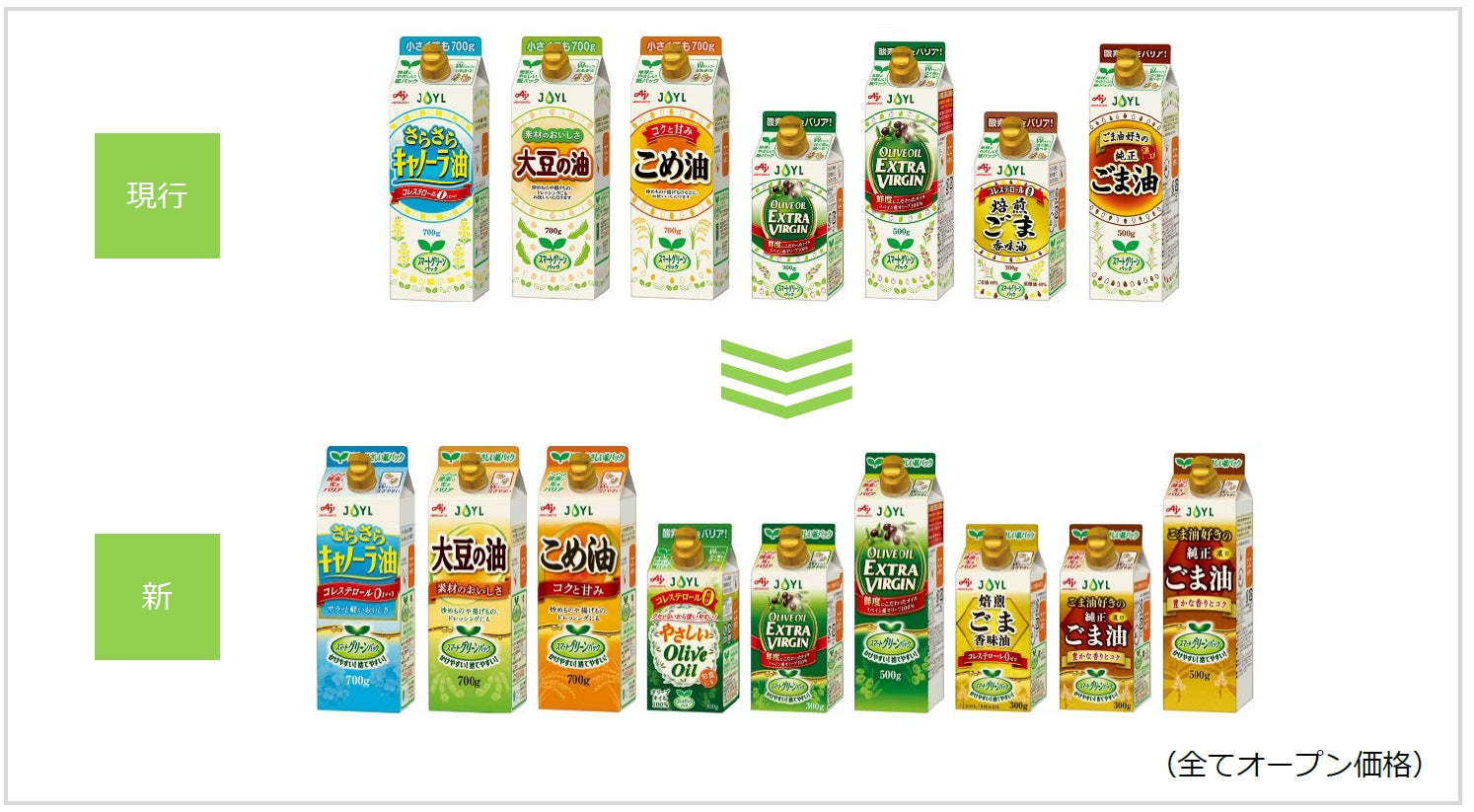 紙パックの食用油「スマートグリーンパック®」シリーズ容器デザインを一新、9製品に拡大!