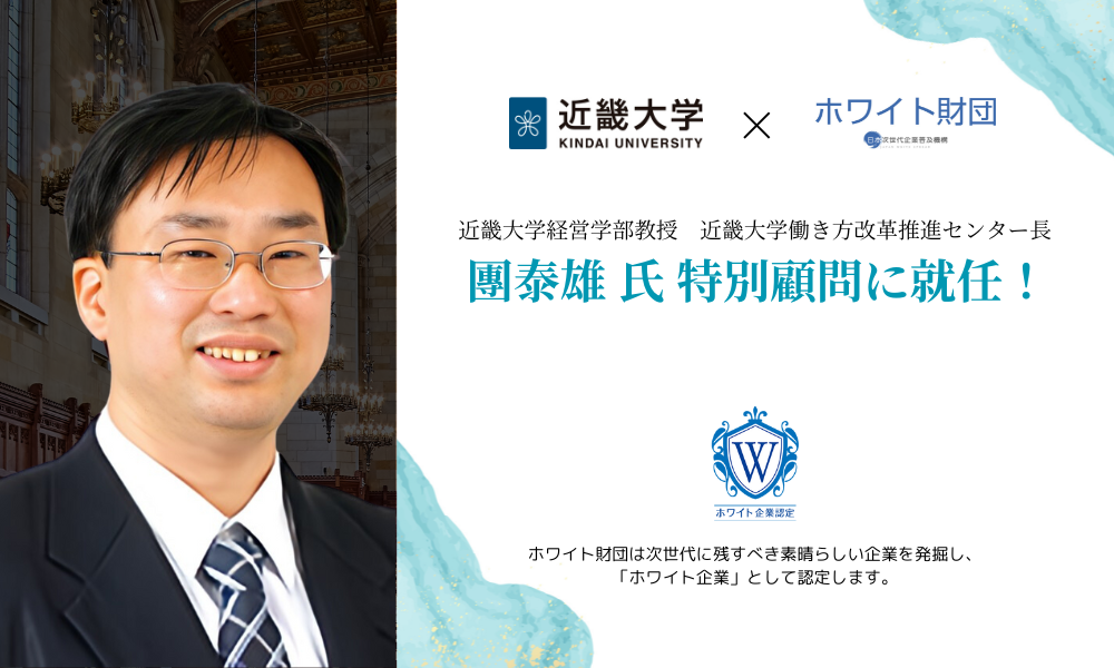 そしてこの度、近畿大学経営学部教授の團教授を特別顧問として迎え、働き方に関する意識変化の促進と、ホワイト財団の運営およびホワイト企業認定の発展にお力添えいただければと思っております。