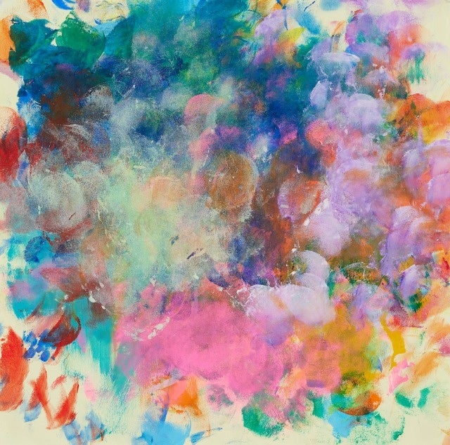 描くことが大好きで、エプロンを着用した瞬間から仕事モードに切り替わります。まずは絵の具を眺め、直感で色を決めていきます。自分の歌声のリズムに合わせて、両手に持ったスポンジを叩き、多色を何十にも重ねていきます。じっと眺めていると色彩が湧き出てくるかのような作品です。