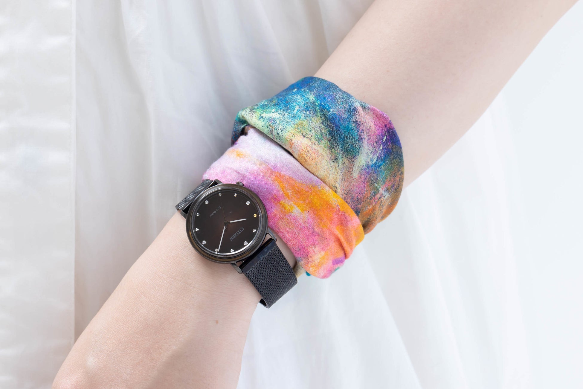 今回、「HERALBONY」と「シチズン エル」は、サステナブルなモノづくりを体現する「シチズン エル」10周年を記念して、シグネチャーライン「アンビリュナ」から発売される「火=陽」からインスピレーションを得た10周年記念限定モデル(EM1007-47E)向けに、その世界観を表現したオリジナルスカーフをコラボレーションしました。スカーフでは、自然の鼓動・美しさを表現しています。