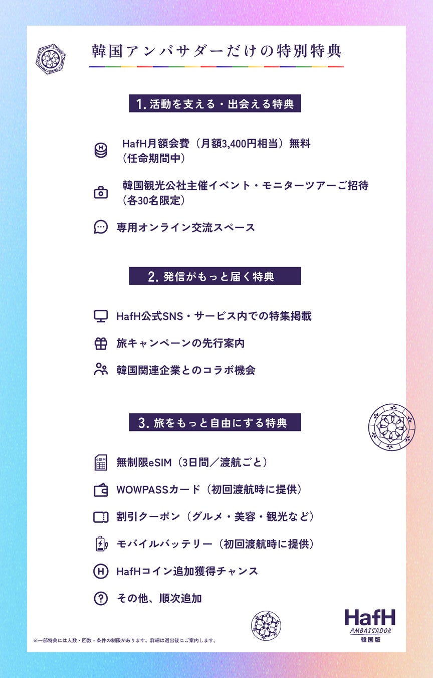 韓国アンバサダーは、就任期間中のHafH会費(月額3,400円相当)が無料(最長2026年3月末まで7ヶ月間無料)、韓国旅で利用できるアンバサダー限定特典が付与される他、30人限定の韓国モニターツアーへ招待されます。韓国アンバサダー同士のコミュニティがオンライン、オフライン双方で運営されていく予定です。