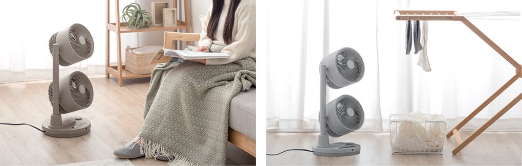 上段ファンのみヒーターが搭載されており、暖房と同時に使う場合には左右の首振りや上下角度の調節機能でさらに室内の空気を循環させ、お部屋全体を暖めます。